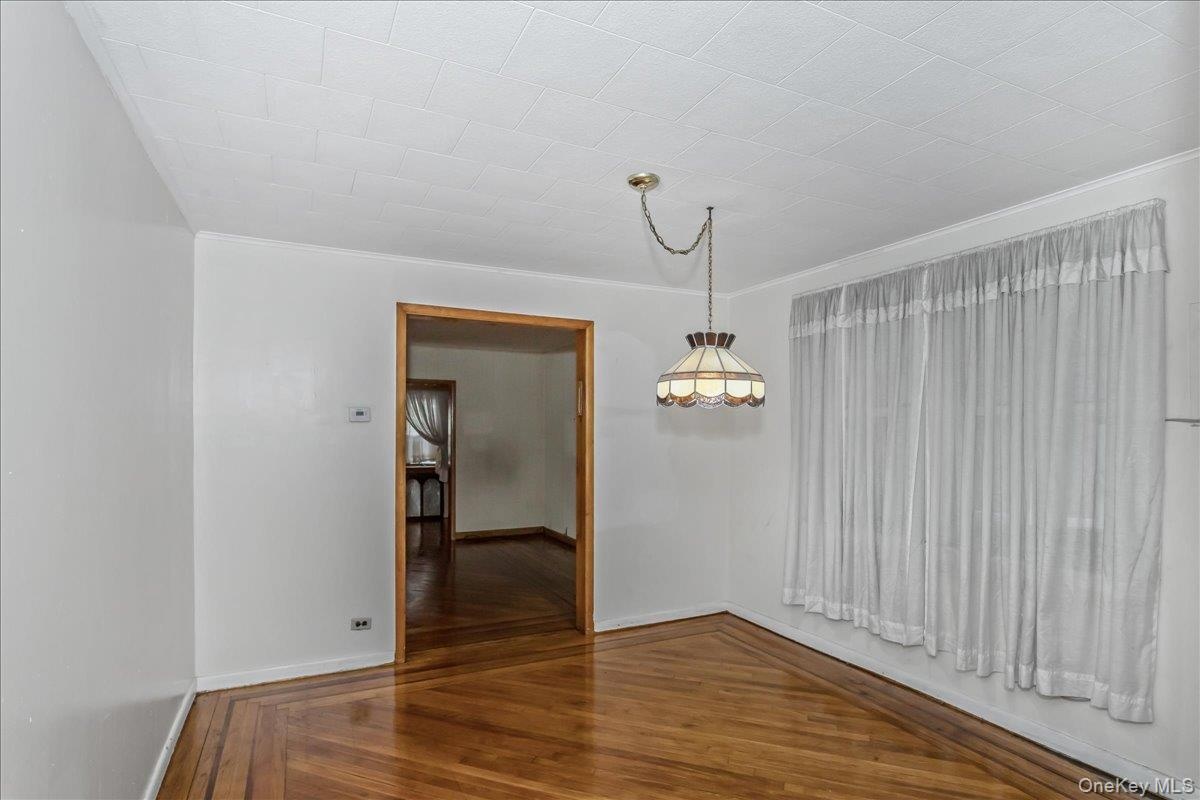 - Unfurnished dining area featuring ornamental molding and wood finished floors