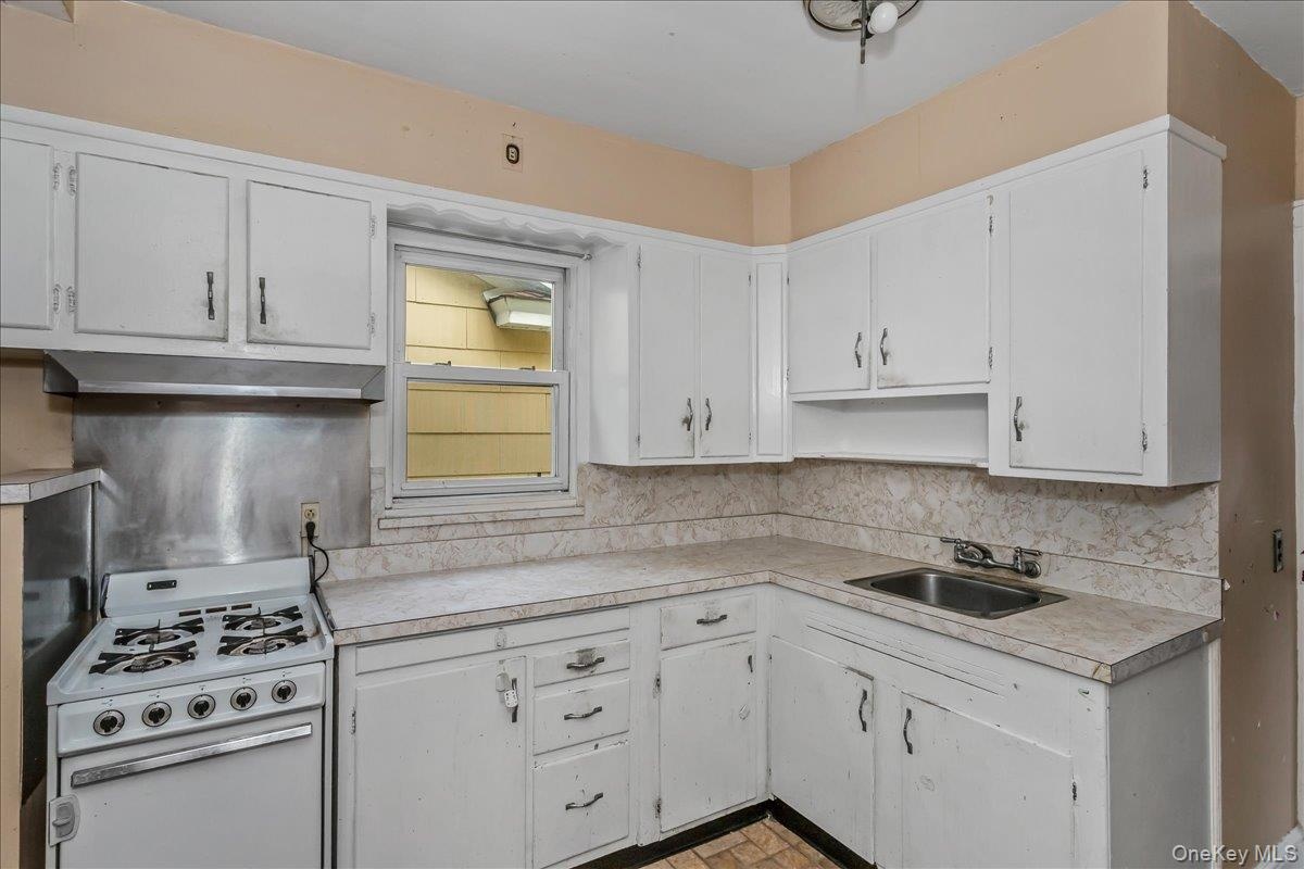 - Kitchen featuring white gas range, white cabinetry, light countertops, radiator heating unit, and beamed ceiling