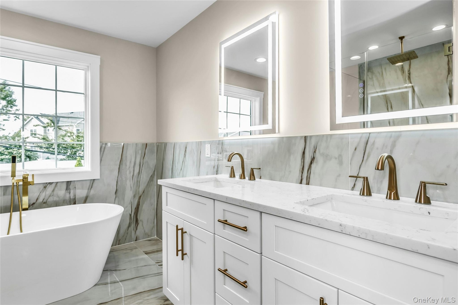 - Full bathroom featuring a freestanding bath, tile walls, double vanity, a wainscoted wall, and a marble finish shower