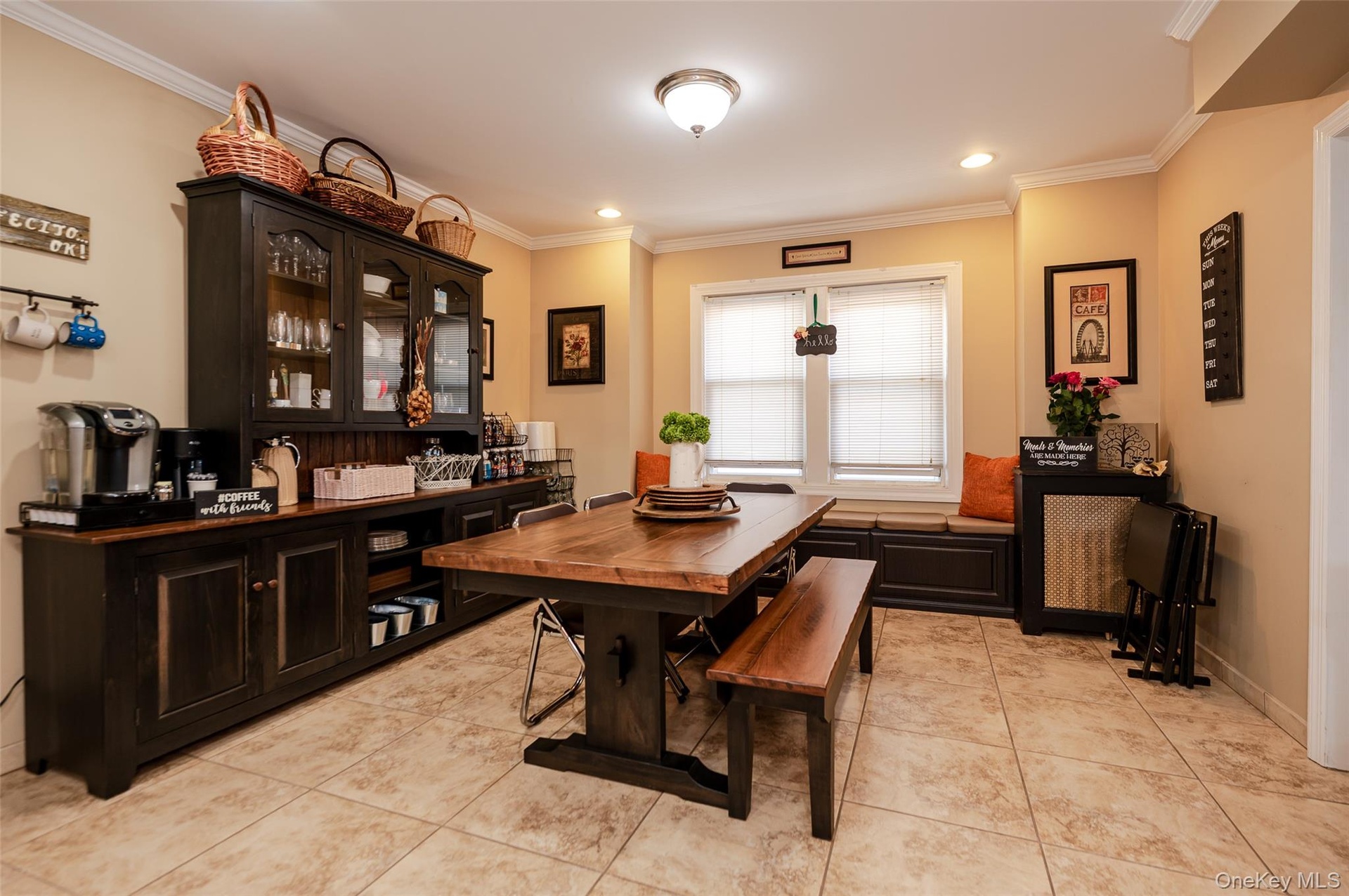 - Dining area featuring ornamental molding, light tile patterned floors, and recessed lighting