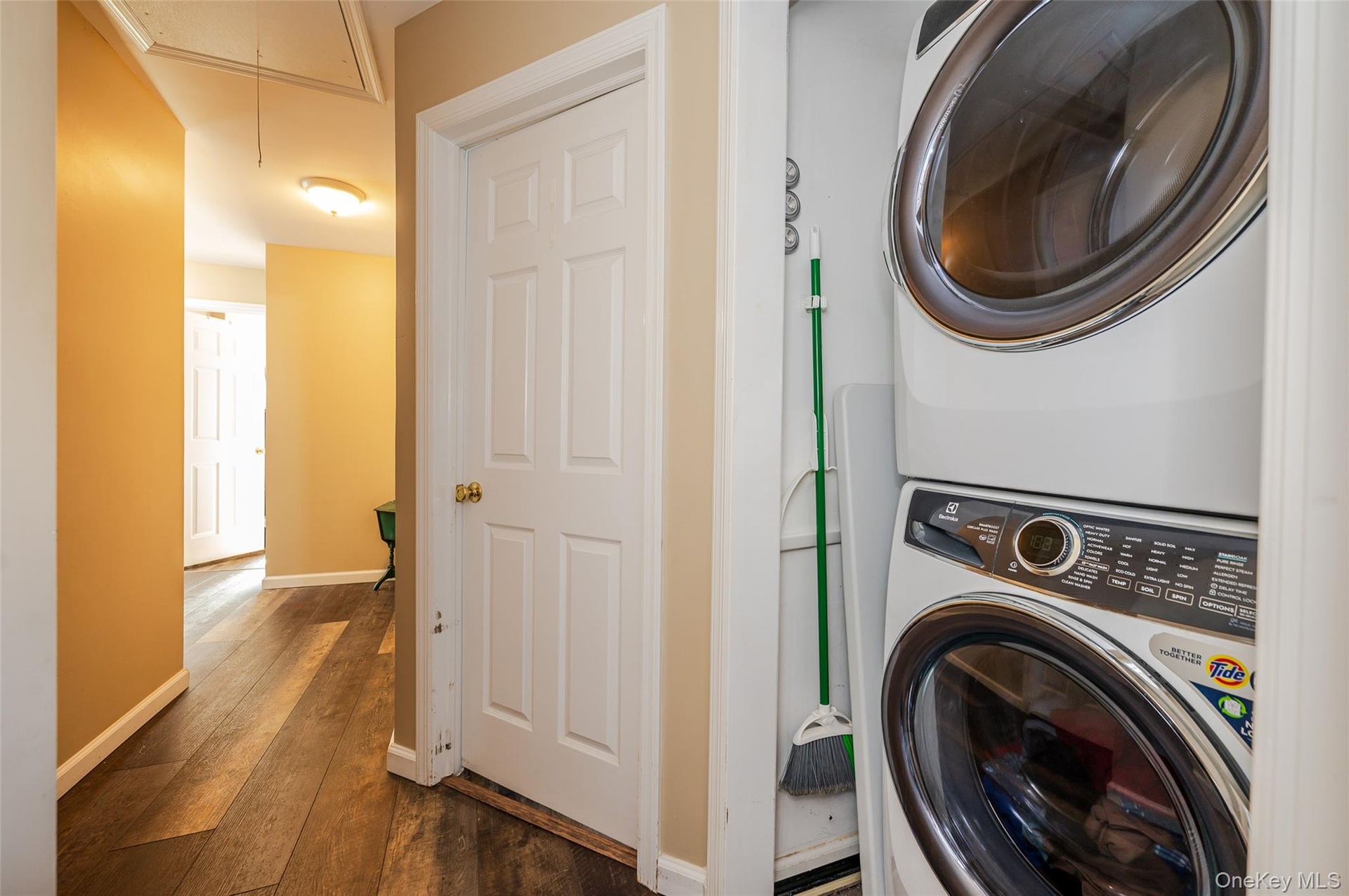 - Washroom featuring attic access, stacked washing machine and dryer, and dark wood-style flooring