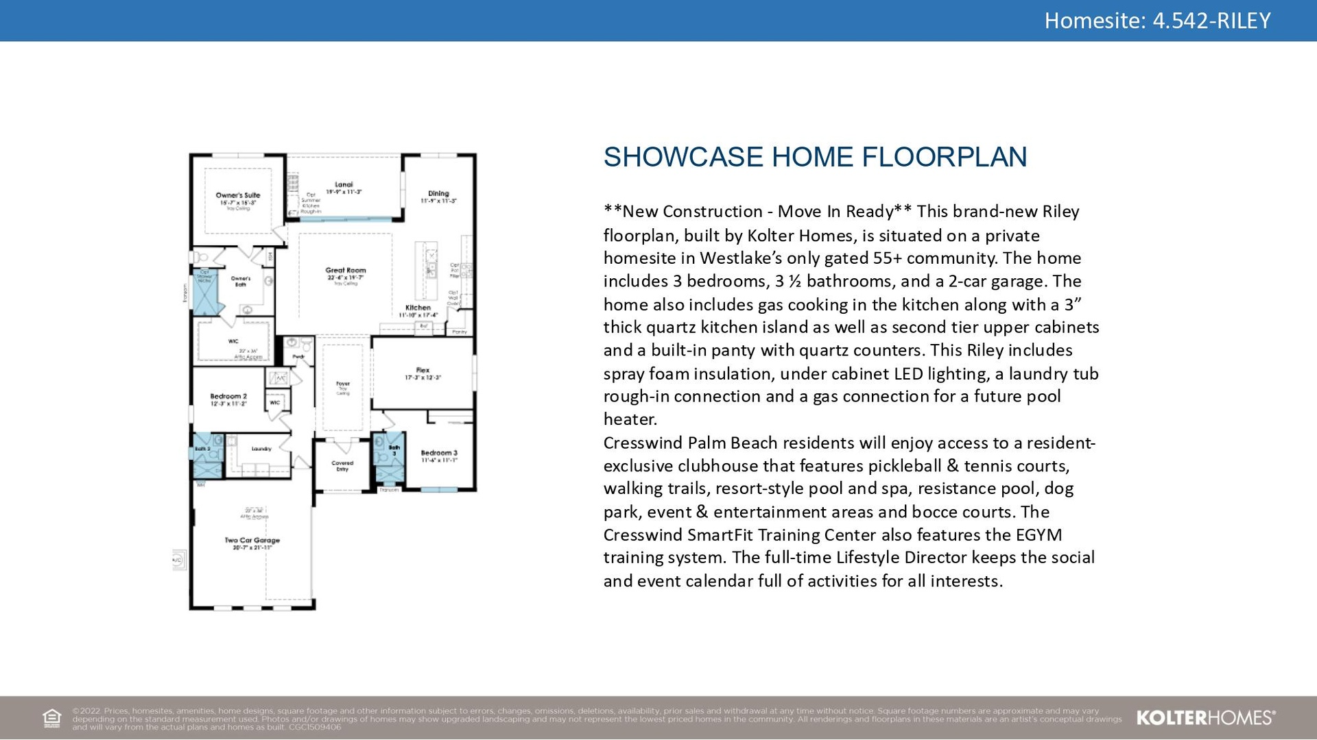 **Under Construction** The home will be available September 25, 2025. This brand-new Riley floorplan, built by Kolter Homes, is situated on a private homesite in Westlake's only gated 55+ community. The home includes 3 bedrooms, 3 1/2 bathrooms, and a 2-car garage. The home also includes gas cooking in the kitchen along with a 3'' thick quartz kitchen island as well as second tier upper cabinets and a built-in panty with quartz counters. This Riley includes spray foam insulation, under cabinet LED lighting, a laundry tub rough-in connection and a gas connection for a future pool heater.