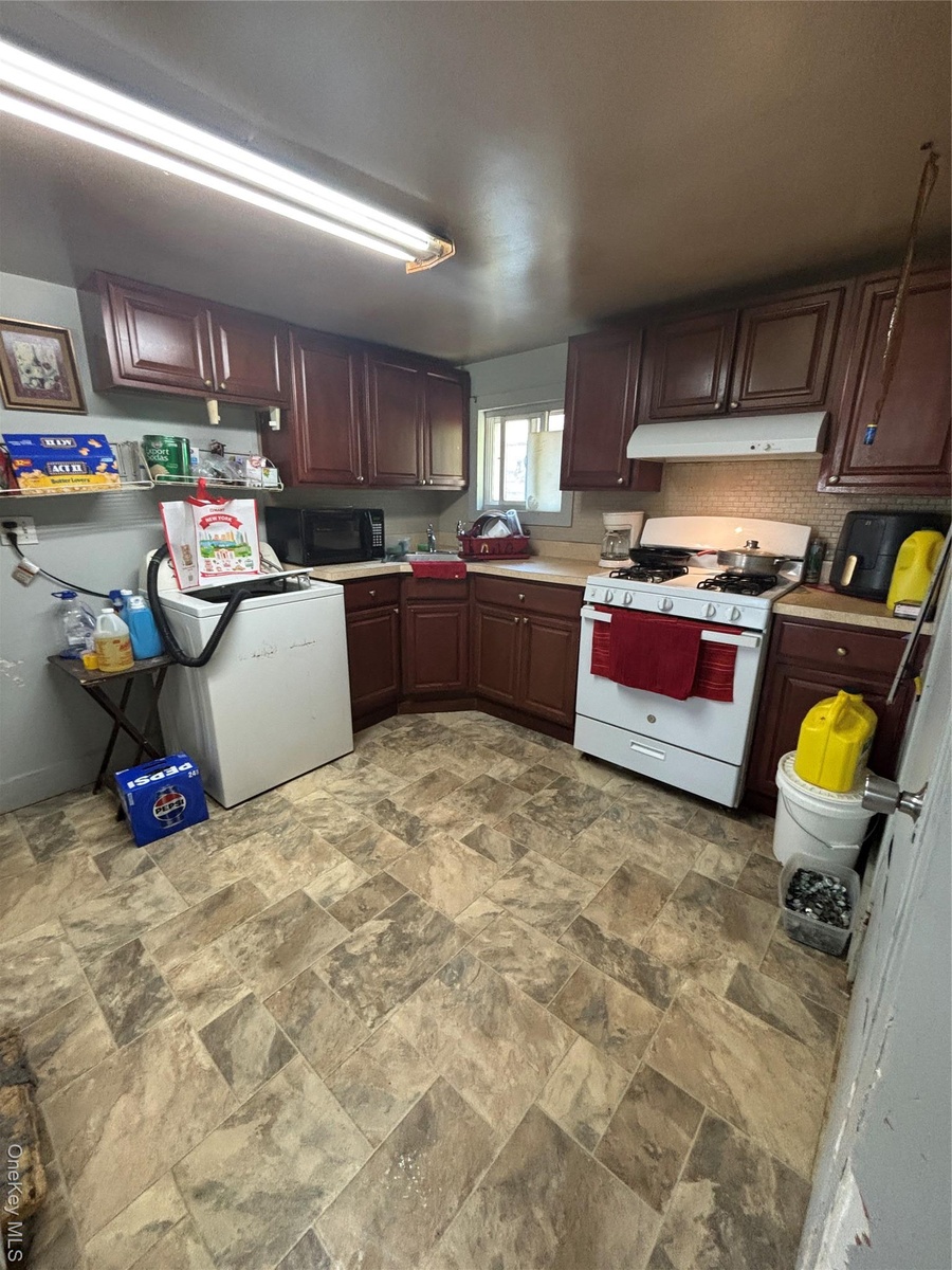 - Kitchen featuring range, light countertops, washer / dryer, stone finish floors, and ventilation hood