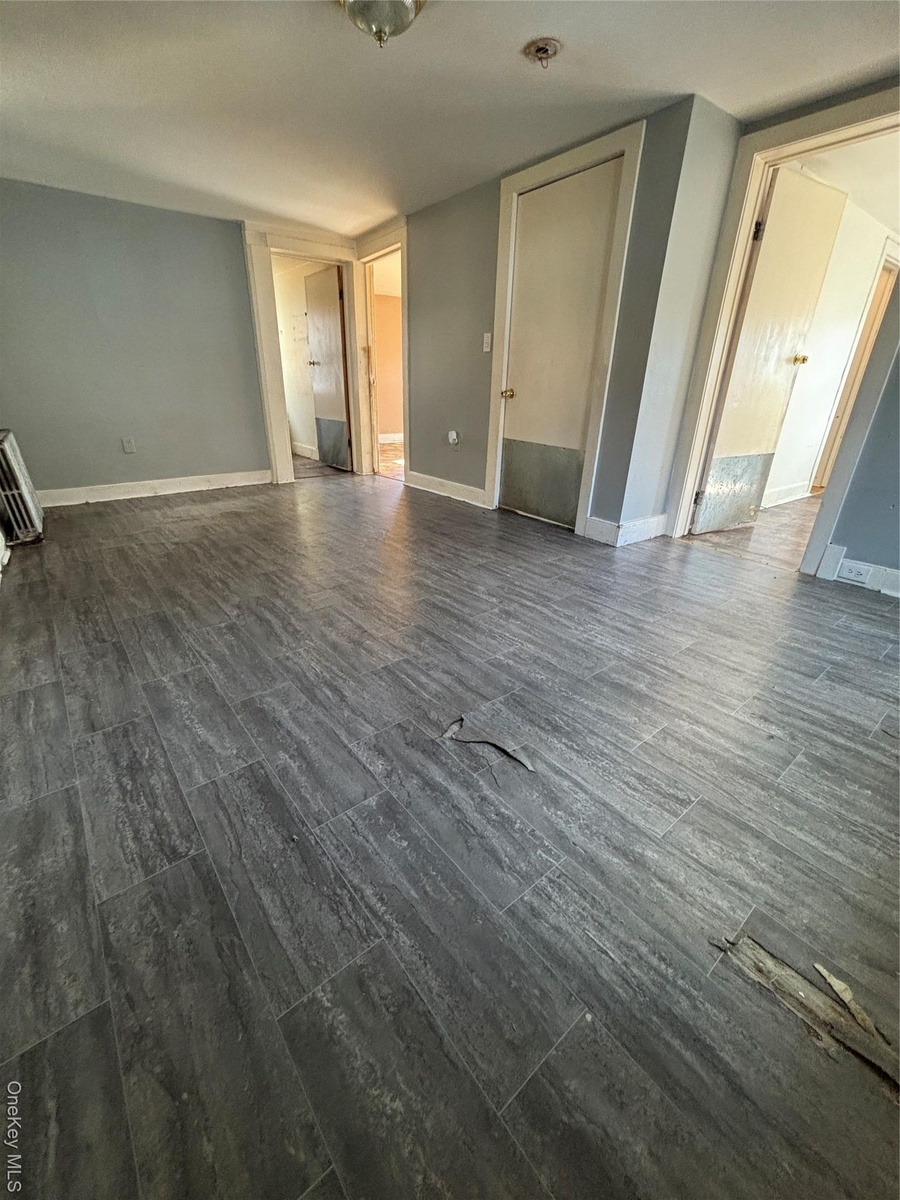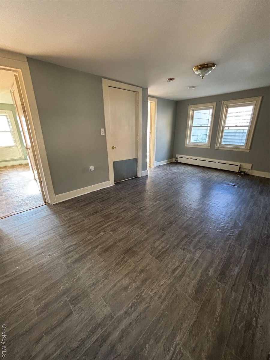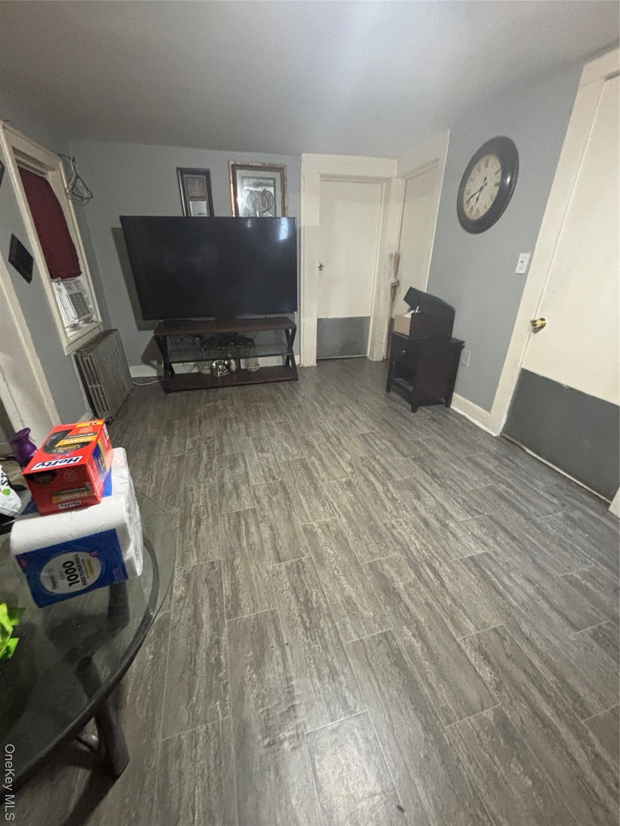- Living room featuring dark wood-style floors and radiator