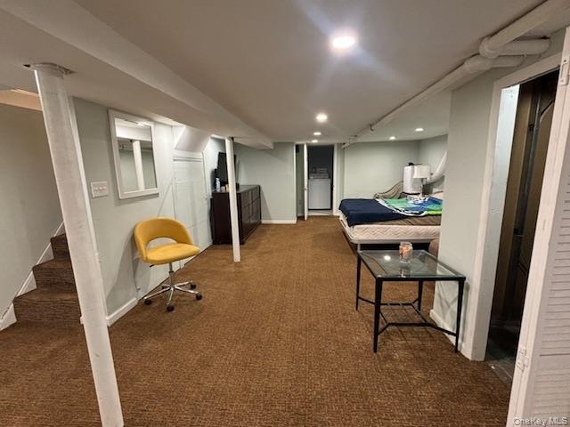 - Carpeted bedroom featuring recessed lighting and washer / clothes dryer