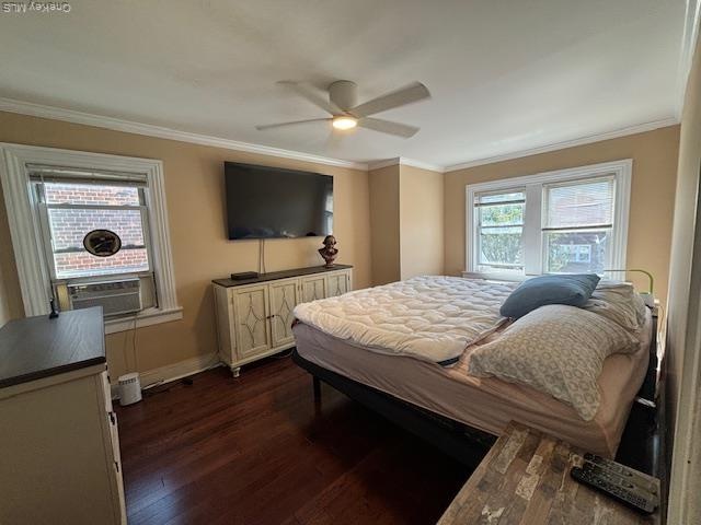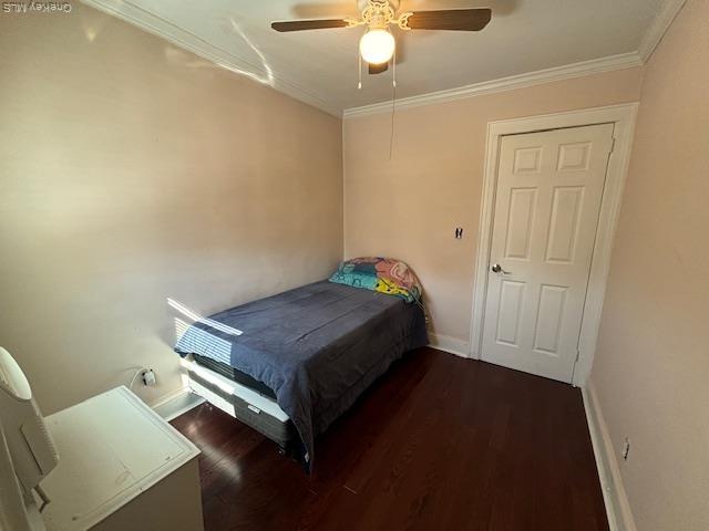 - Bedroom featuring crown molding, dark wood-type flooring, and ceiling fan