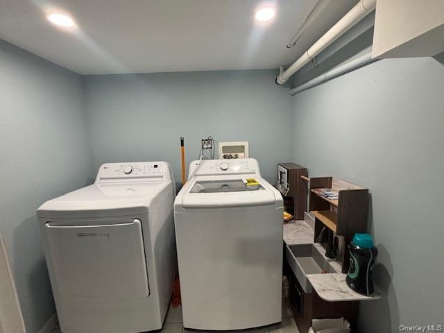 - Laundry area with washing machine and dryer, recessed lighting, and light tile patterned floors