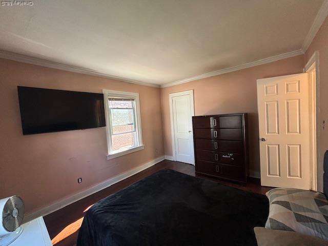 - Bedroom featuring crown molding, dark wood-style flooring, and a closet