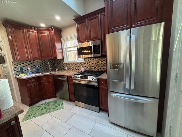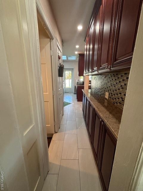 - Kitchen with stainless steel appliances, tasteful backsplash, light tile patterned floors, light stone countertops, and recessed lighting