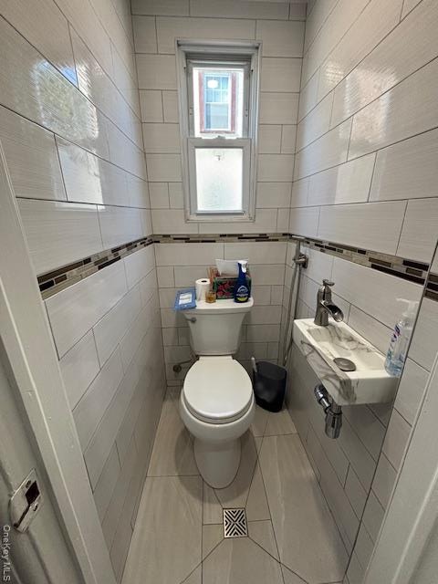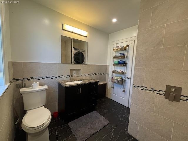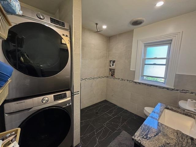- Laundry room with tile walls, stacked washing machine and dryer, dark marble finish flooring, recessed lighting, and a wainscoted wall