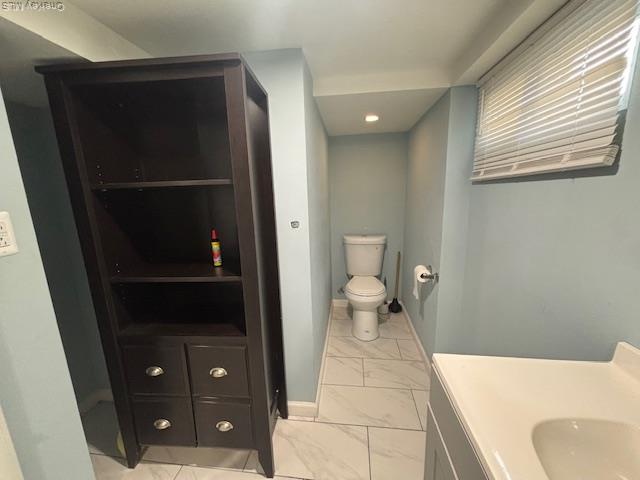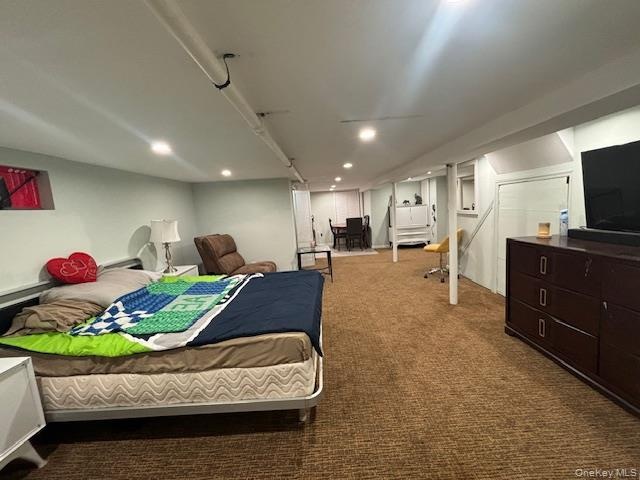 - Finished below grade area with stairway, dark colored carpet, and recessed lighting