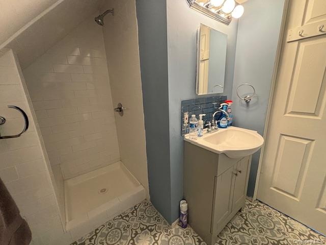 - Bathroom featuring a stall shower, vanity, and light tile patterned floors