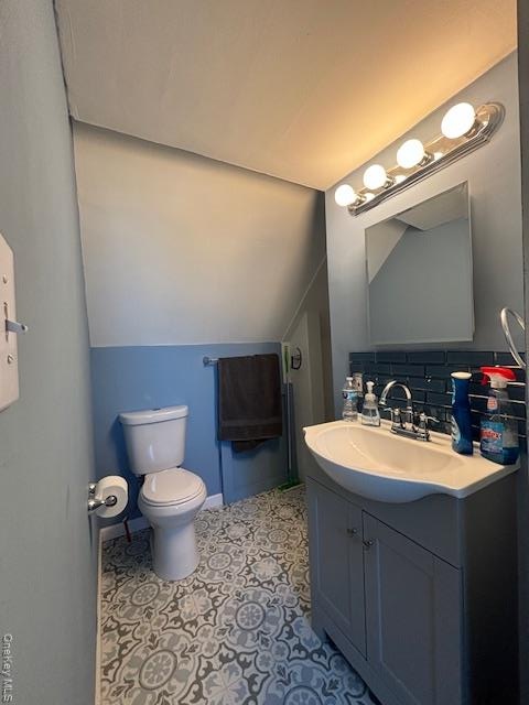 - Bathroom with vanity, vaulted ceiling, and backsplash