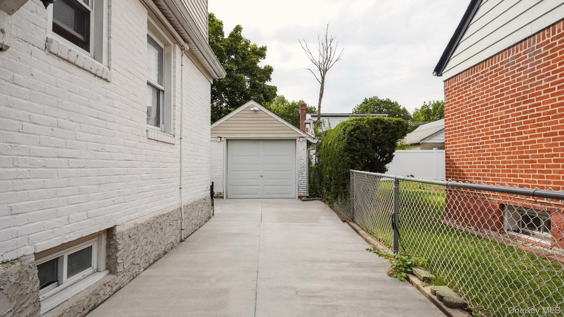 - View of side of home with driveway, an outdoor structure, a garage, and brick siding