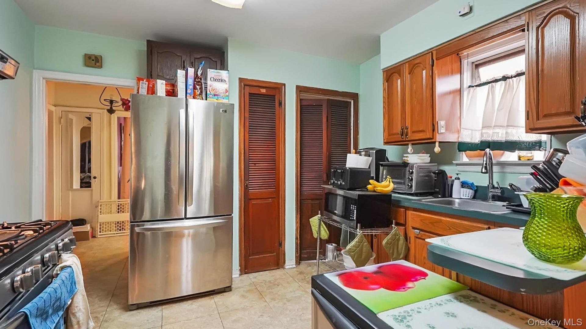 - Kitchen with stainless steel appliances, brown cabinetry, light tile patterned floors, and dark countertops