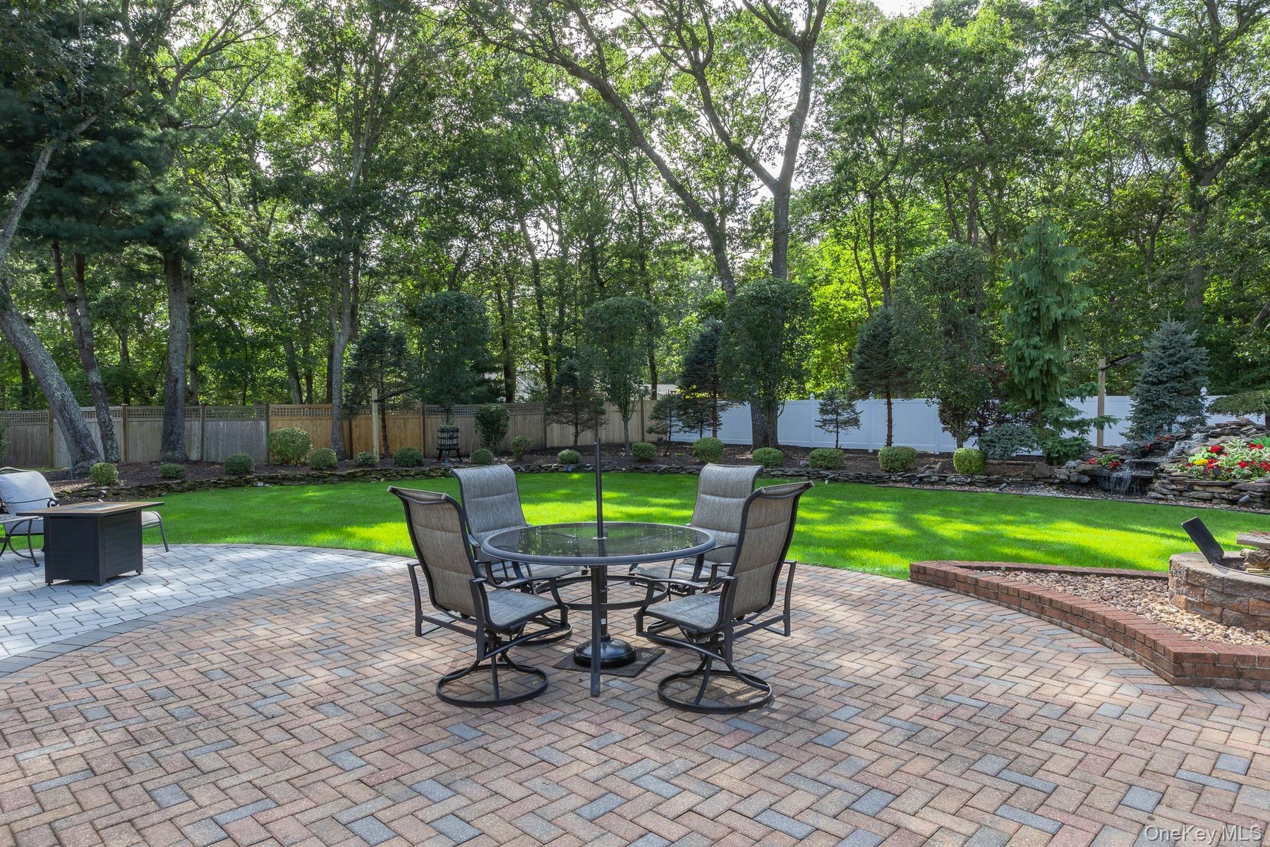 - Fenced backyard with a patio, outdoor dining space, and a fire pit