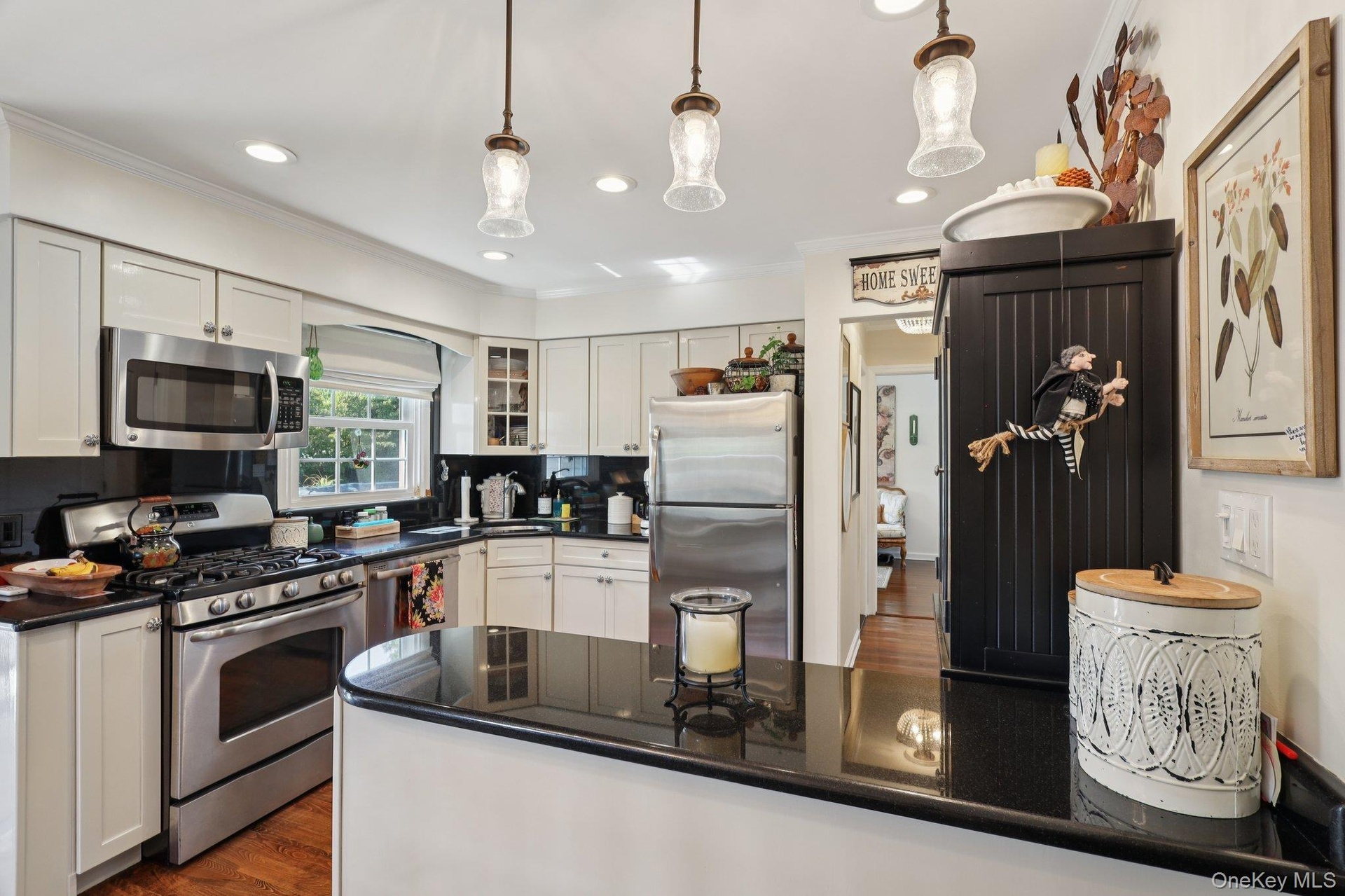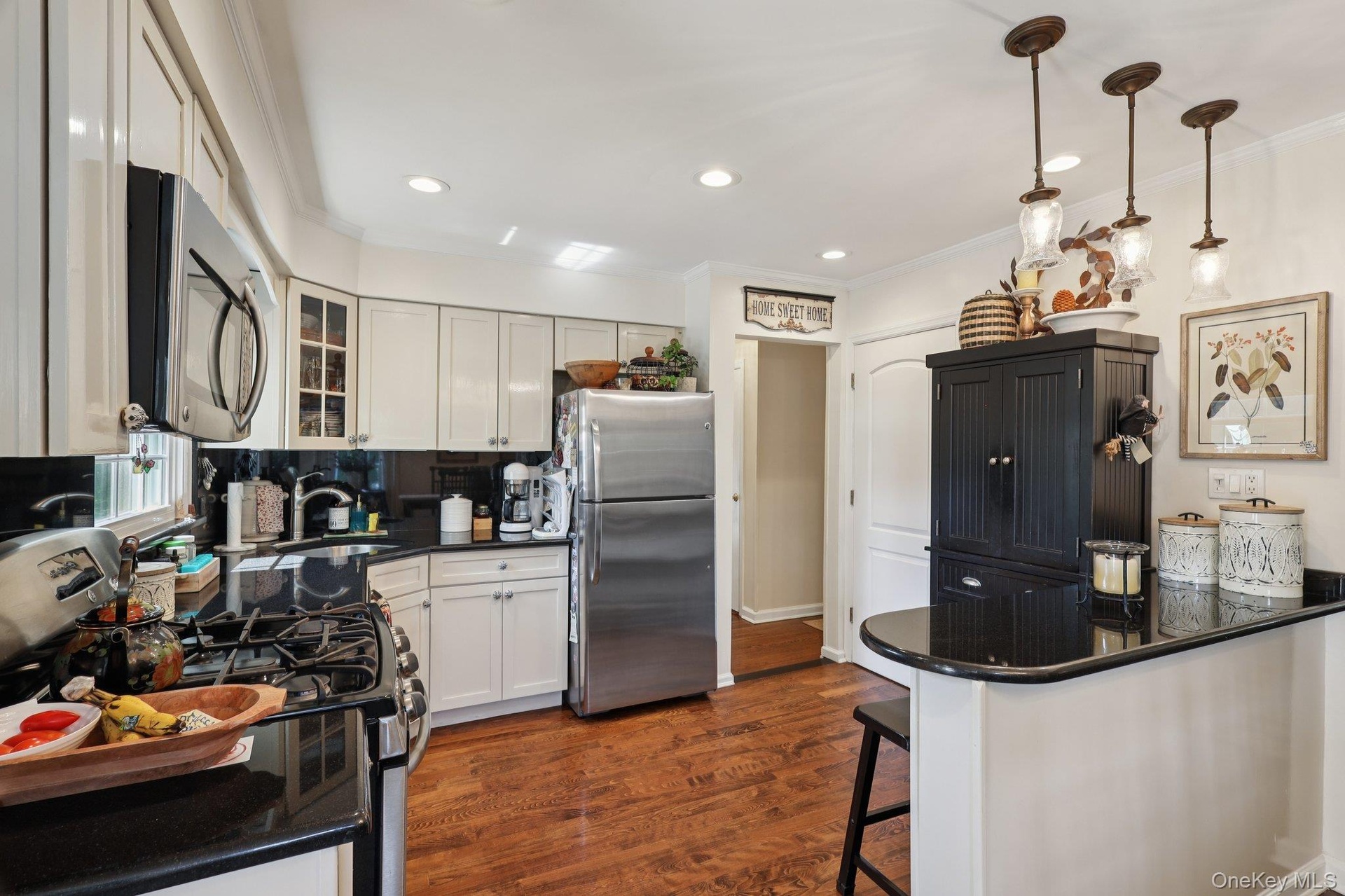 - Kitchen featuring appliances with stainless steel finishes, dark wood-style flooring, white cabinetry, crown molding, and decorative light fixtures