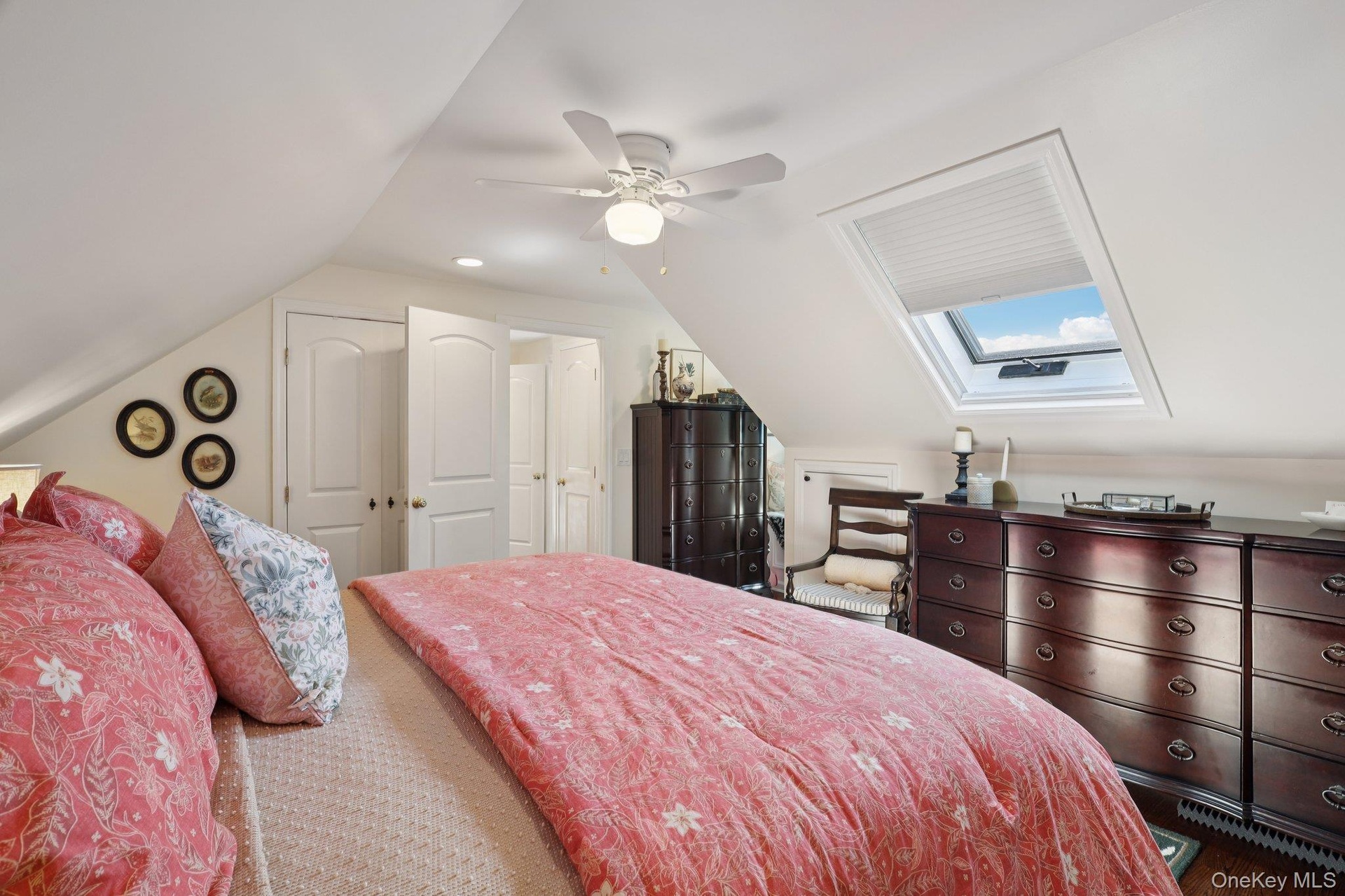 - Bedroom featuring vaulted ceiling, a skylight, and a ceiling fan