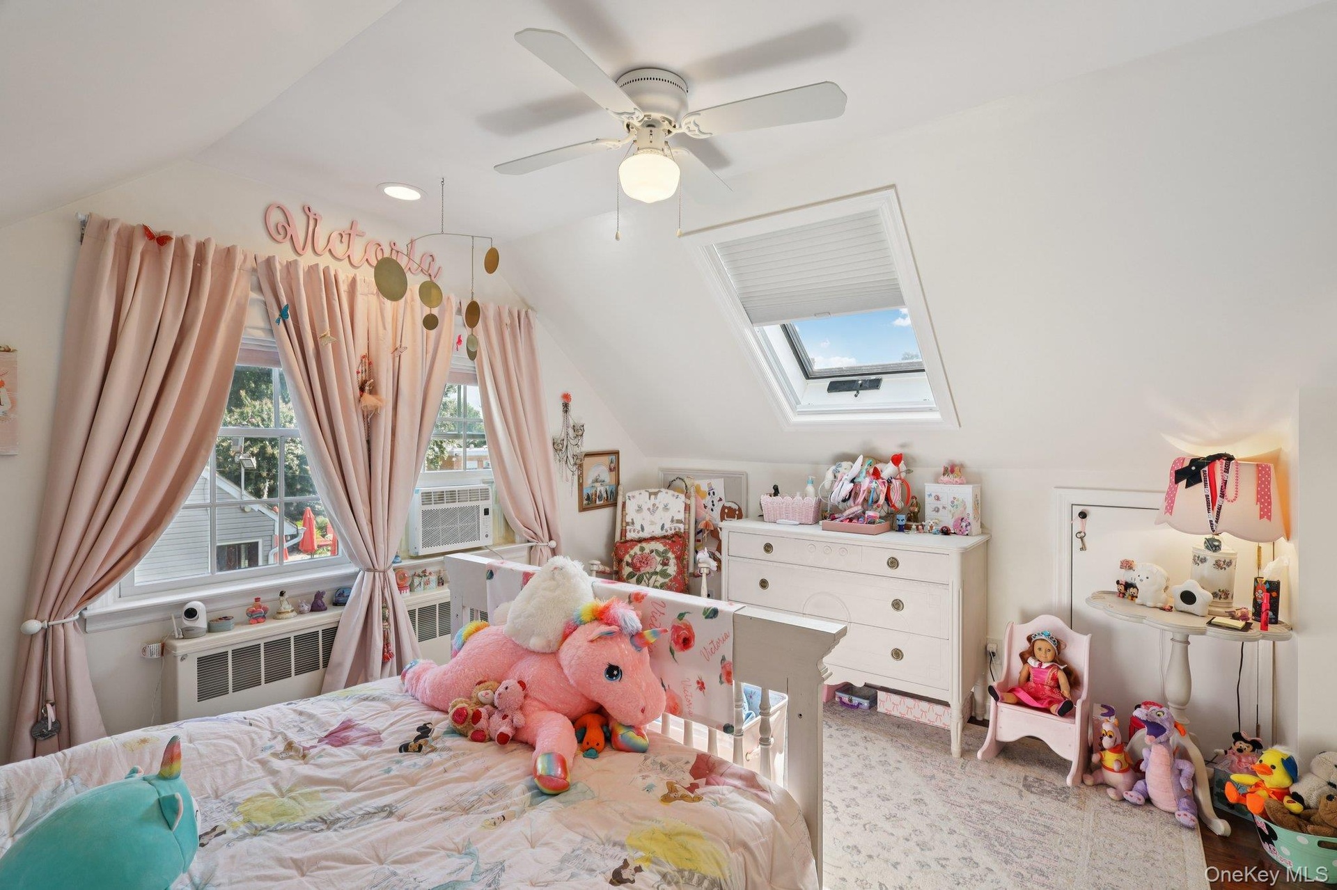- Bedroom with lofted ceiling, a skylight, multiple windows, radiator heating unit, and a ceiling fan