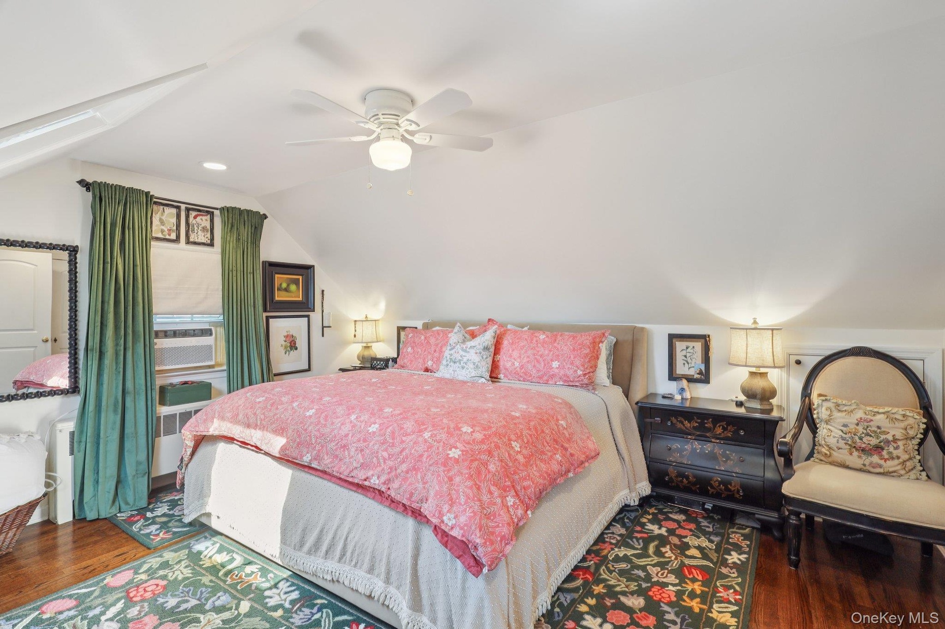 - Bedroom with a skylight, dark wood-type flooring, vaulted ceiling, and a ceiling fan