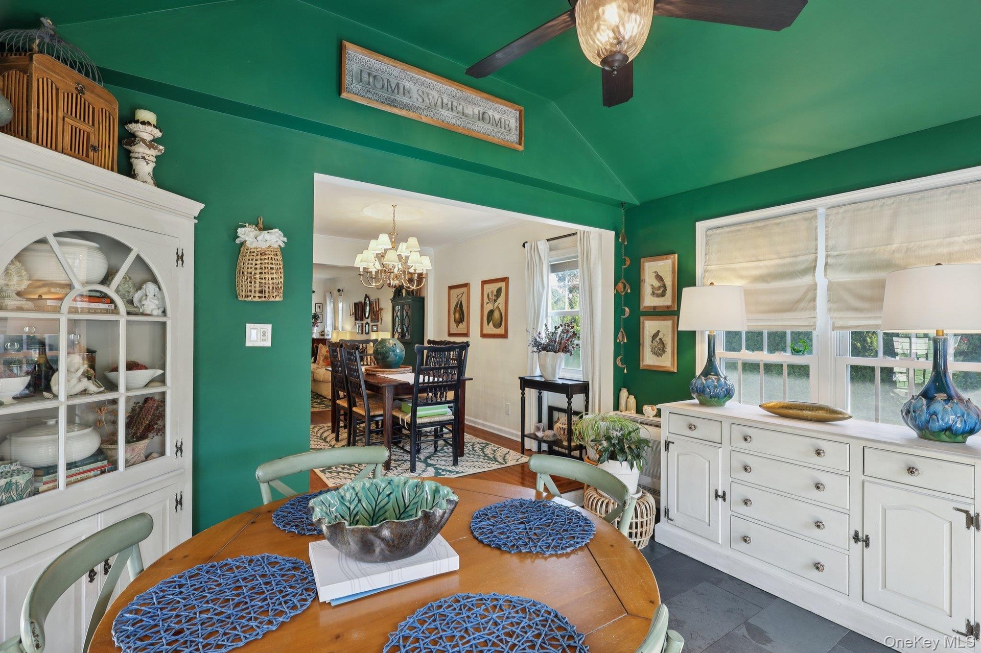 - Dining room featuring vaulted ceiling, a chandelier, and a ceiling fan