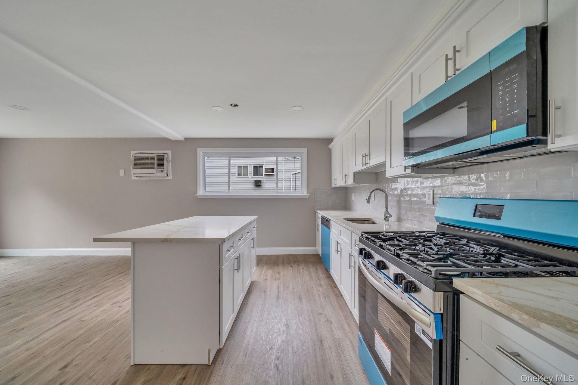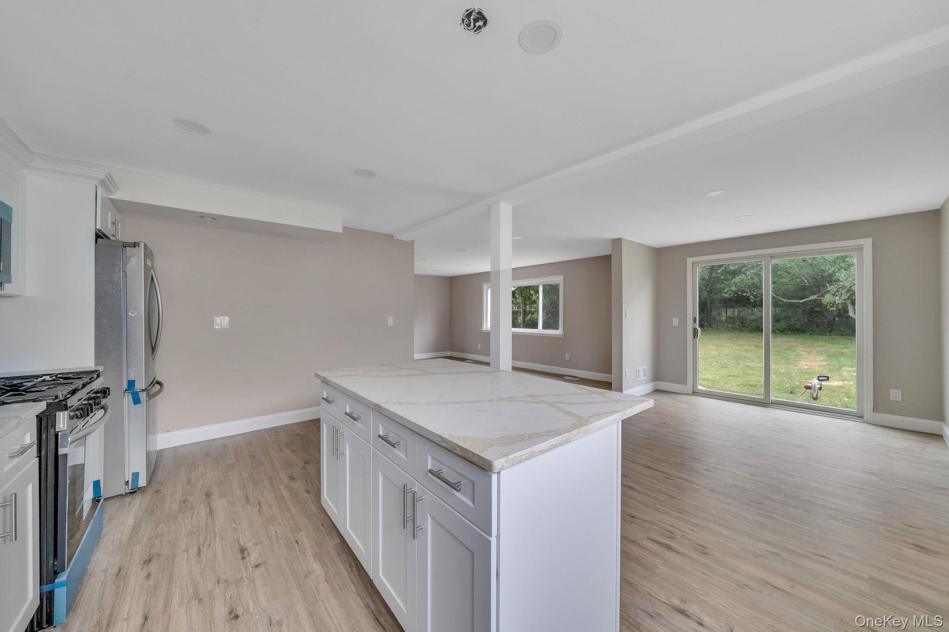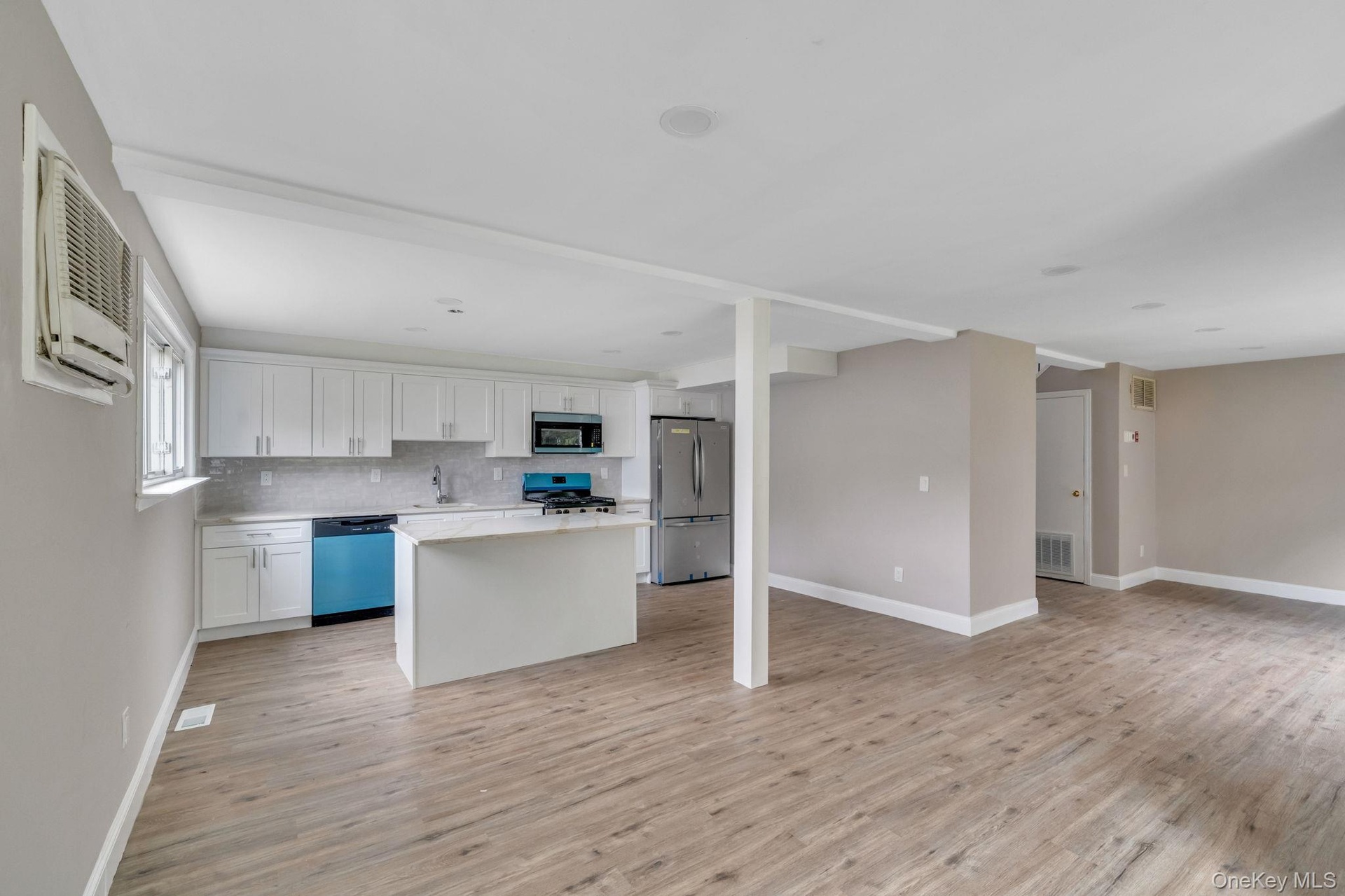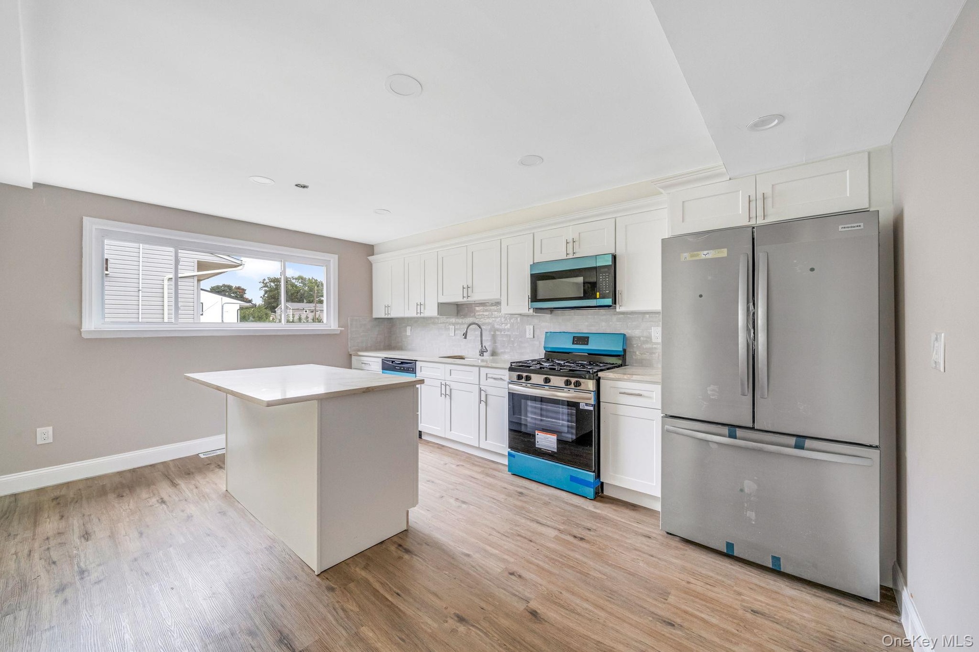 - Kitchen with open floor plan, a center island, white cabinetry, appliances with stainless steel finishes, and tasteful backsplash