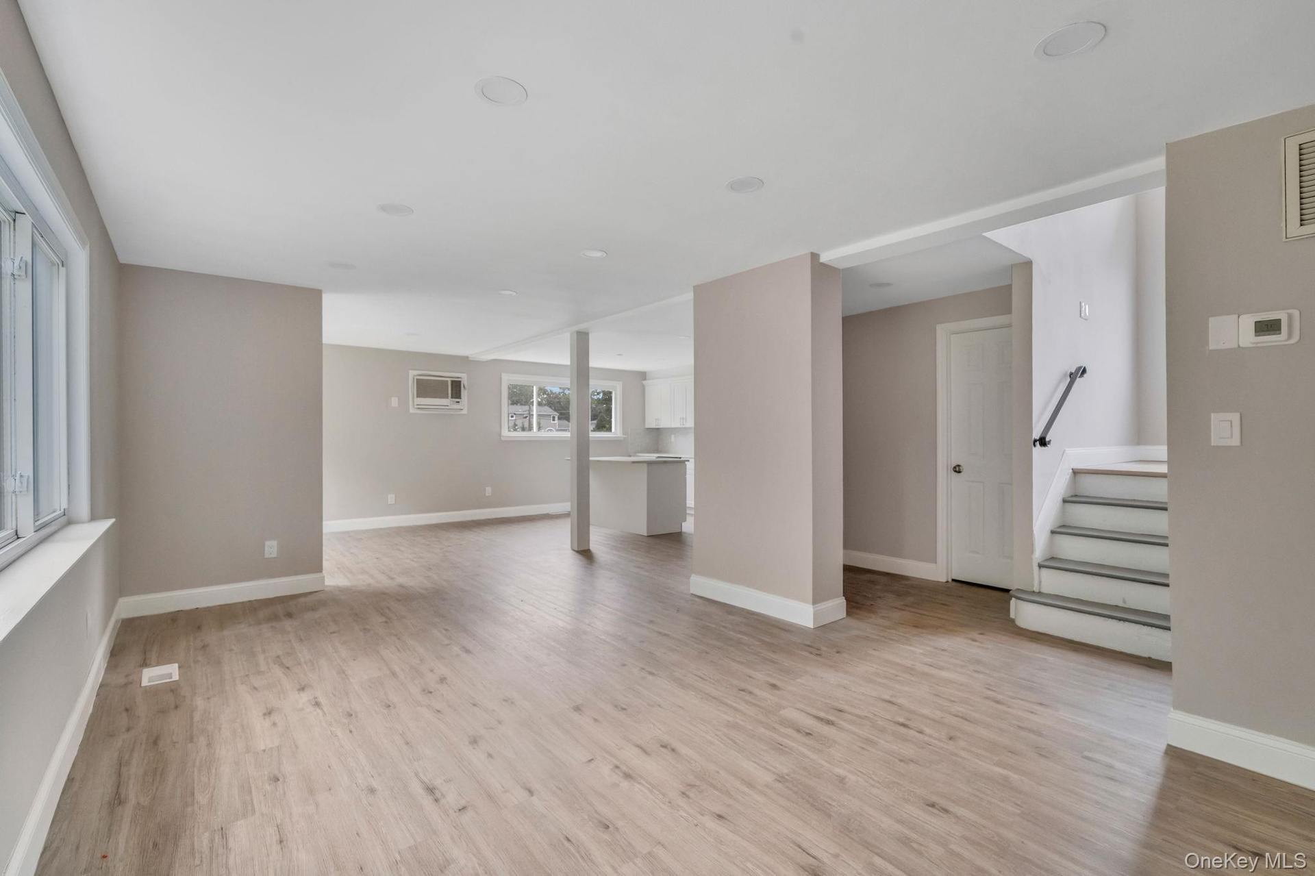 - Unfurnished living room featuring light wood-style floors, stairs, and recessed lighting