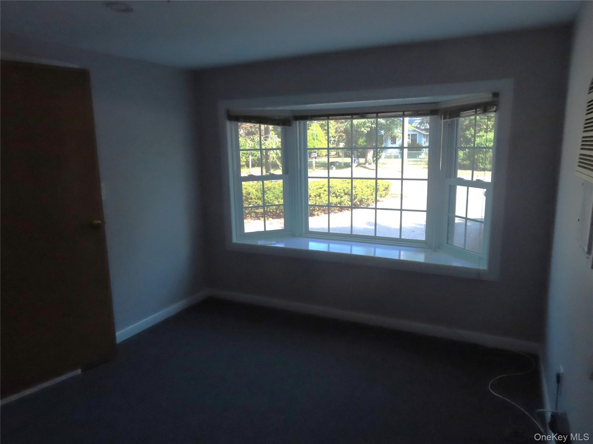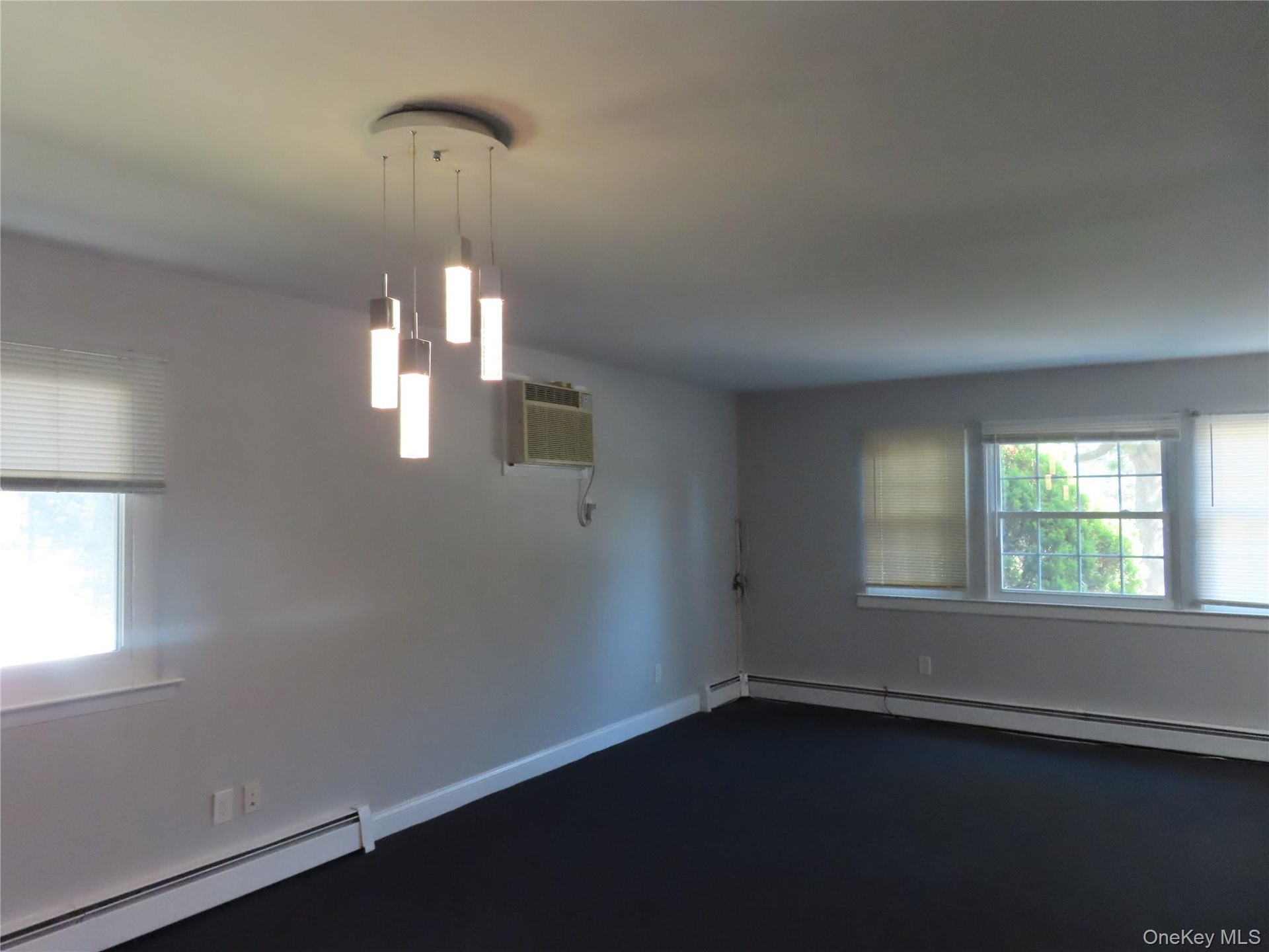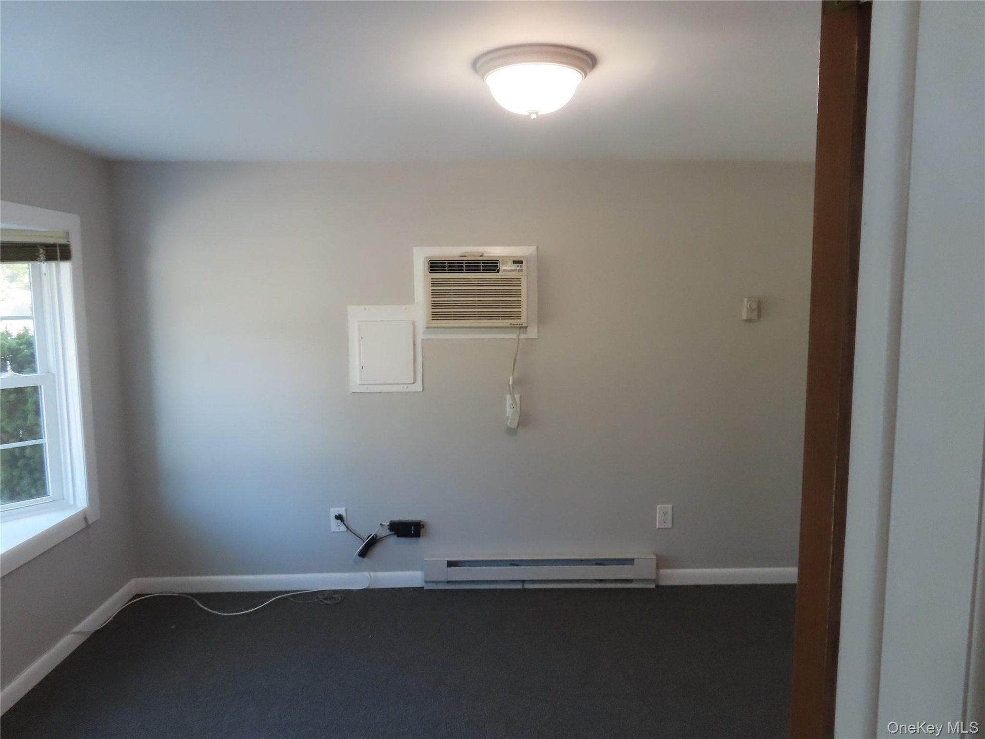 - Empty room featuring baseboard heating, a wall unit AC, and dark carpet