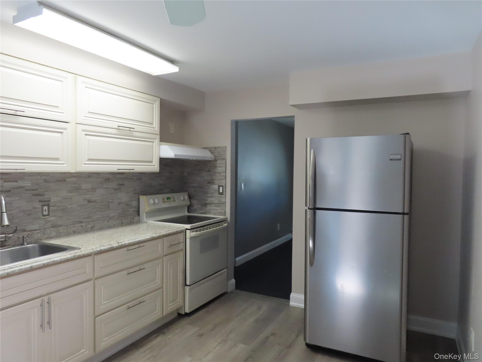 - Kitchen with electric stove, freestanding refrigerator, decorative backsplash, light wood-style floors, and under cabinet range hood