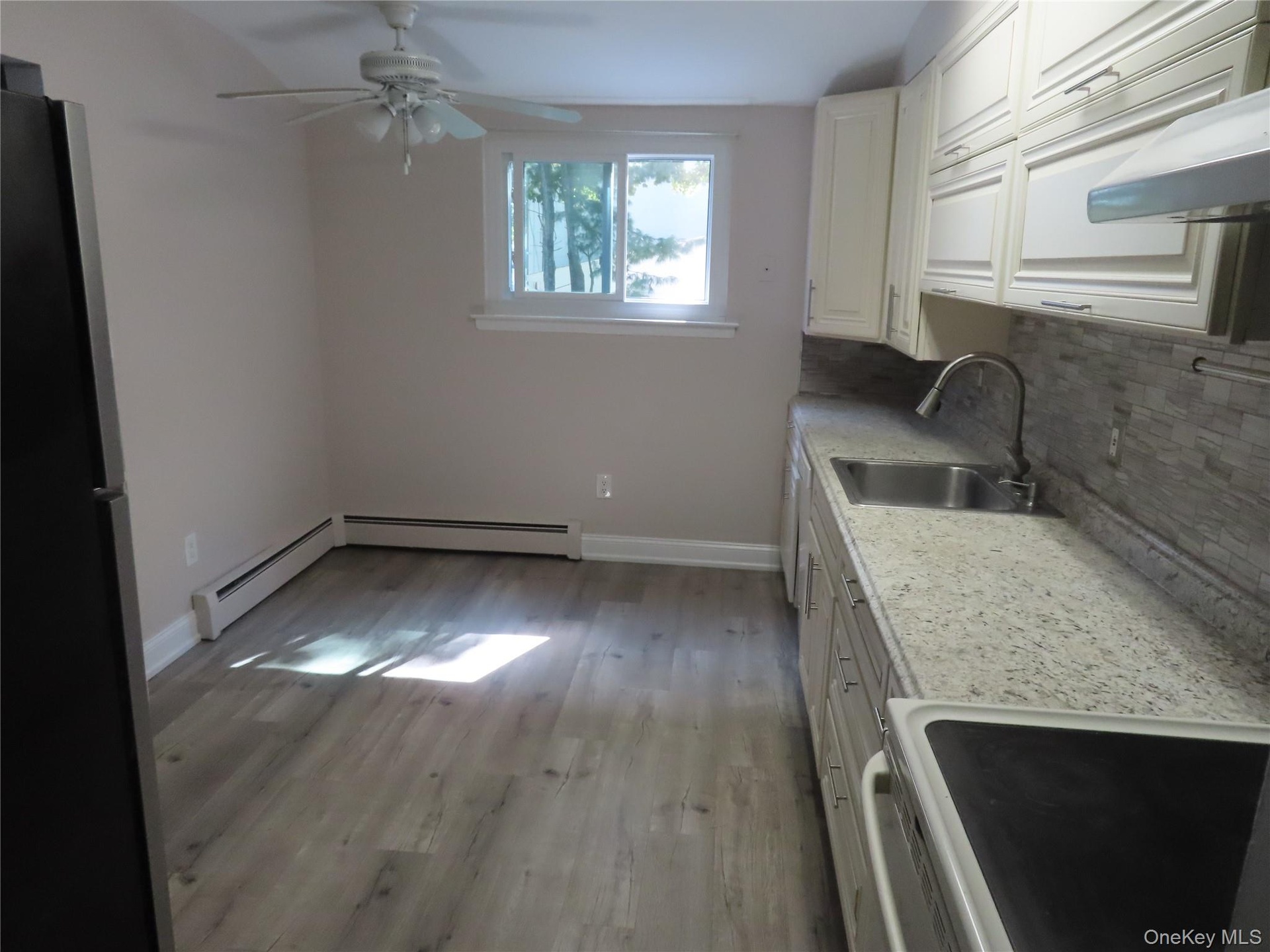 - Kitchen featuring white appliances, backsplash, range hood, and white cabinetry