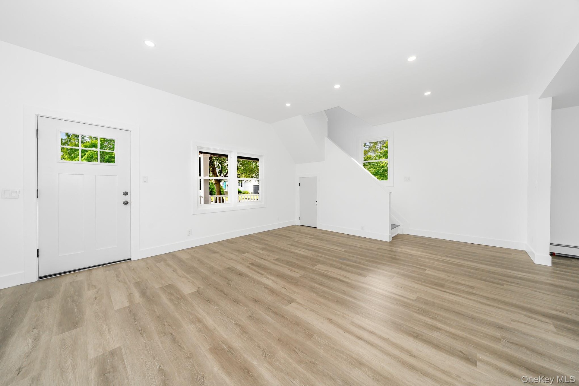 - Unfurnished living room featuring recessed lighting, light wood-type flooring, stairway, and a baseboard radiator