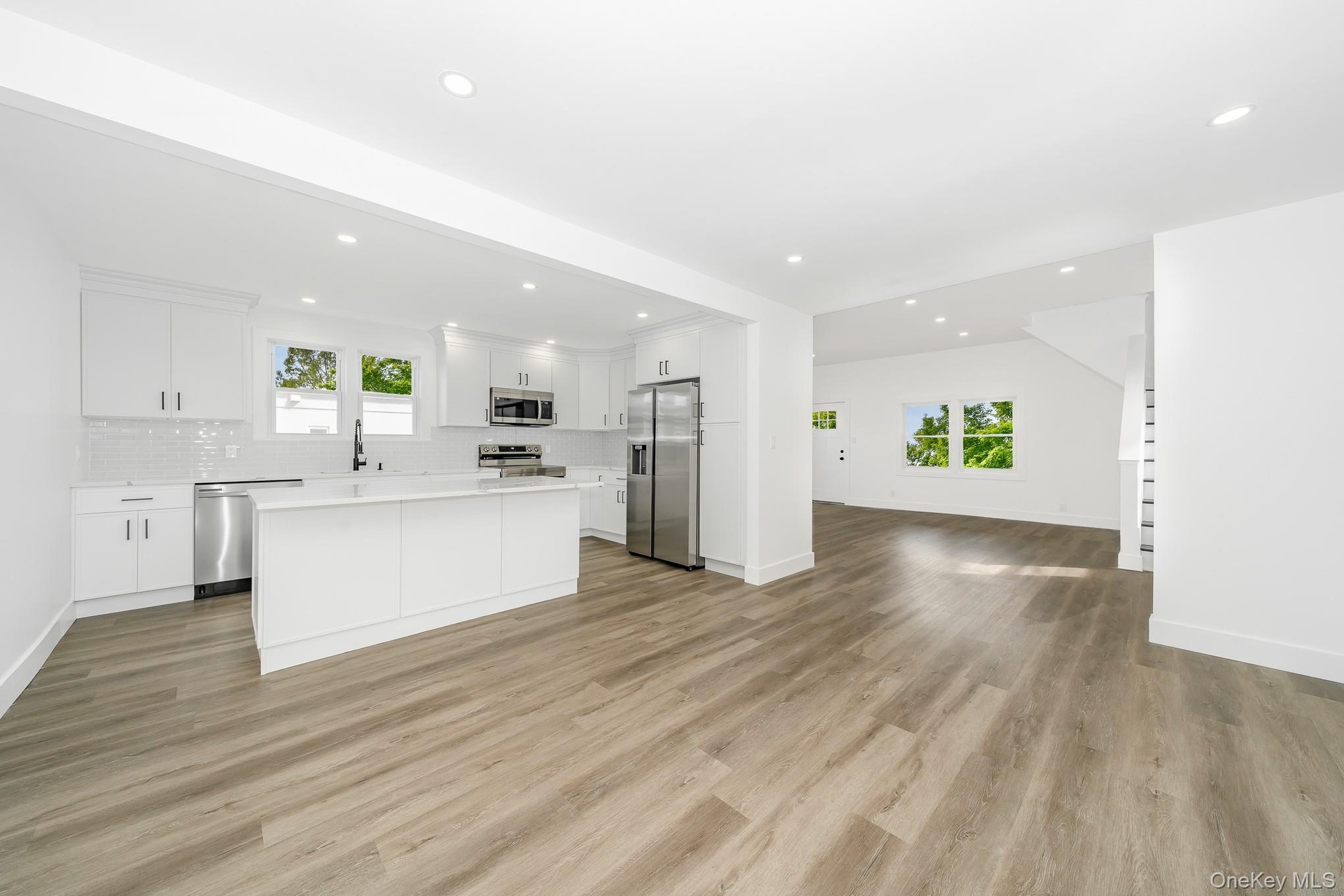 - Unfurnished living room with recessed lighting, plenty of natural light, light wood finished floors, and stairway