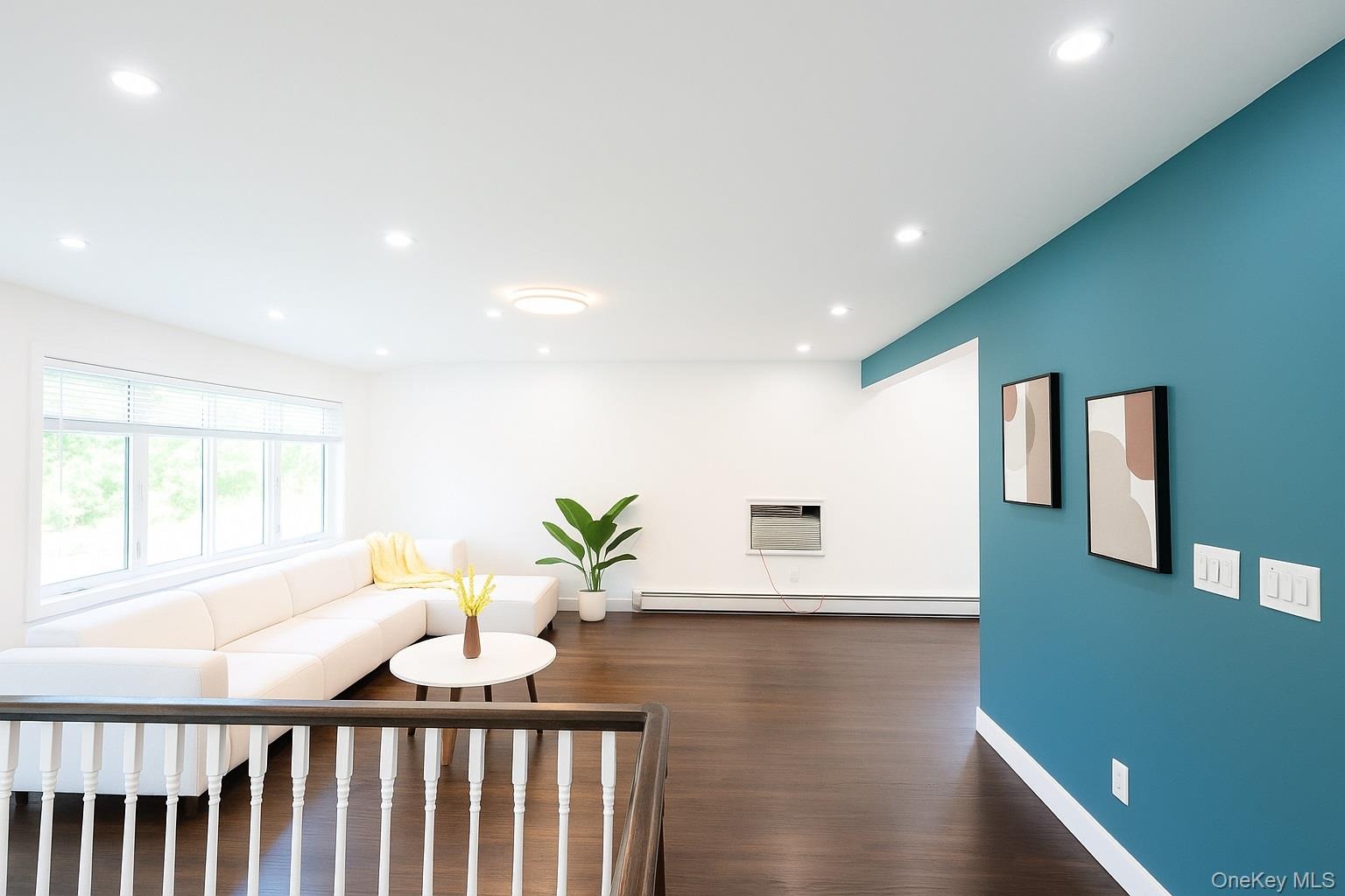 - Living area featuring recessed lighting, dark wood-style flooring, a baseboard heating unit, and a wall mounted AC
