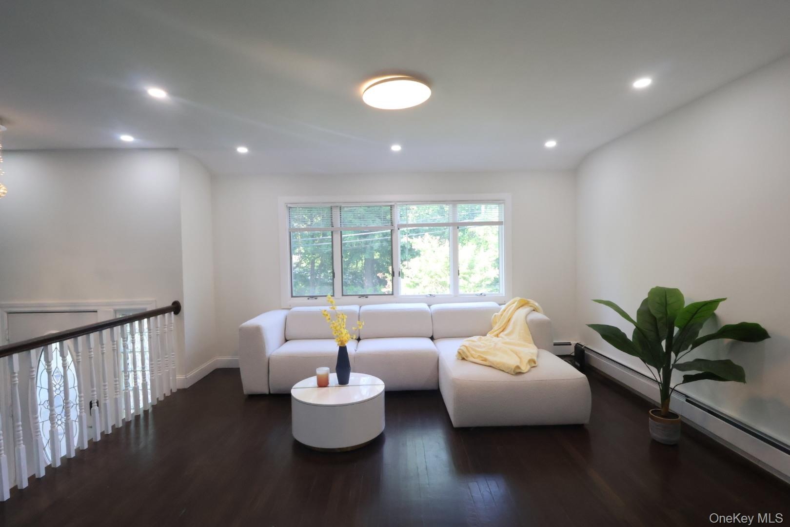 - Living room featuring dark wood-style floors, recessed lighting, and a baseboard radiator