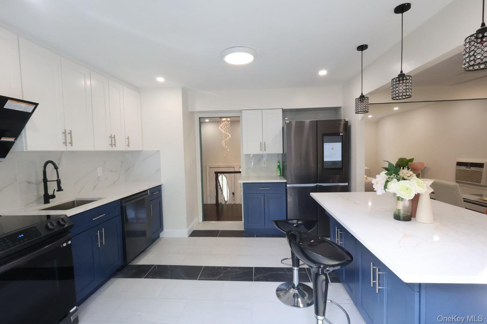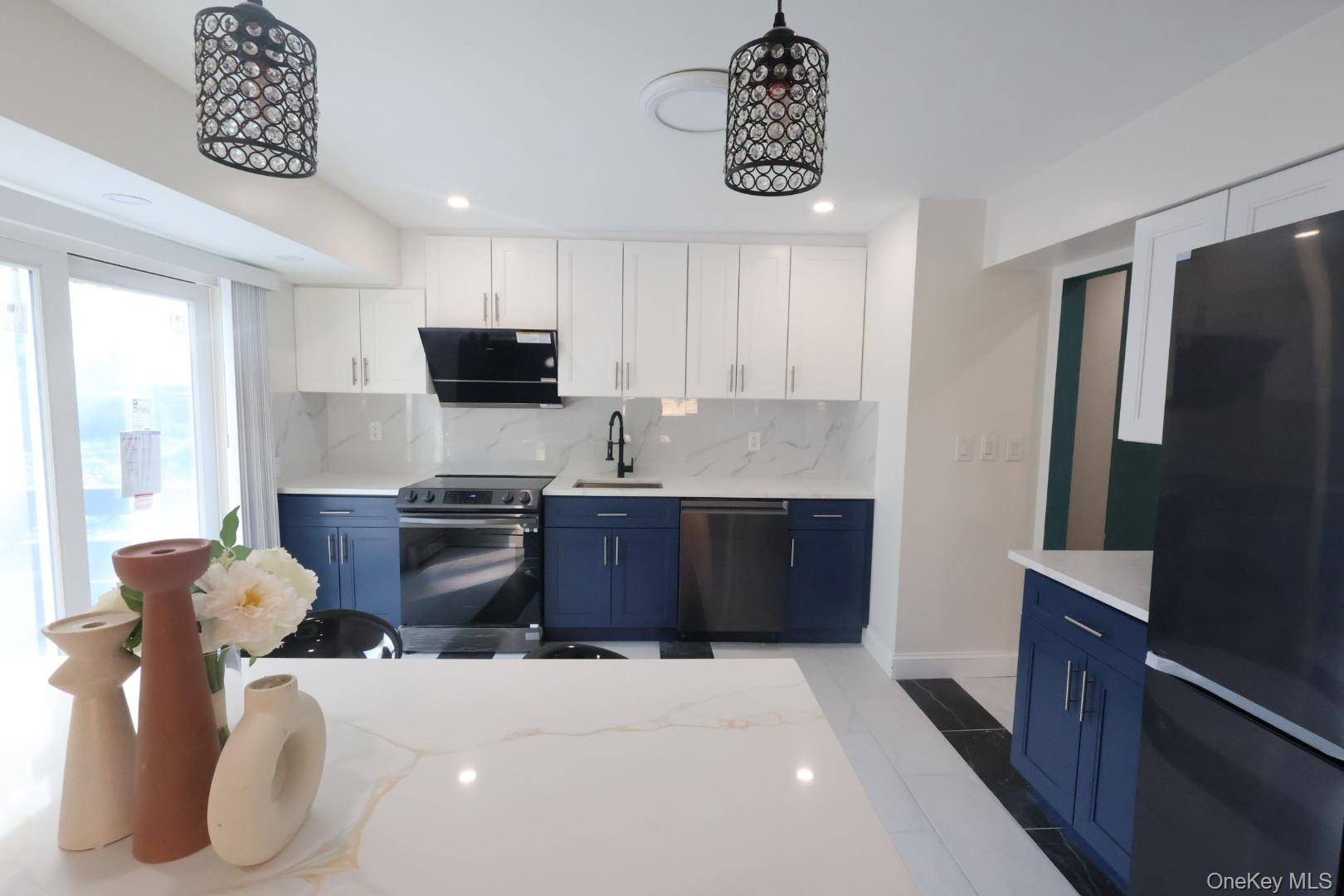 - Kitchen with blue cabinets, white cabinetry, black / electric stove, backsplash, and recessed lighting