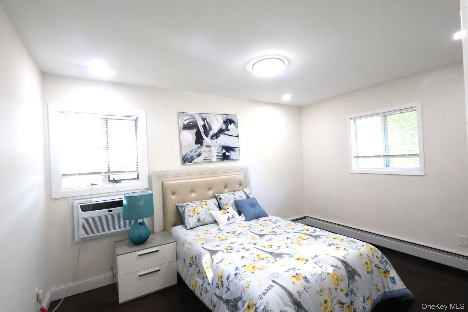 - Bedroom with dark wood finished floors, a baseboard heating unit, and recessed lighting