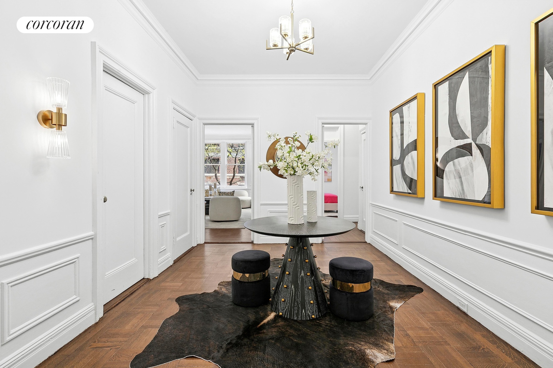 A traditional Classic 9 with soaring 10-foot ceilings, this four-bedroom features a semi-private elevator landing, which opens into a dramatic 10' x 14' entrance foyer/gallery which seamlessly flows into the north-facing living and dining rooms-bathed in natural light with tree-lined views over 92nd Street.