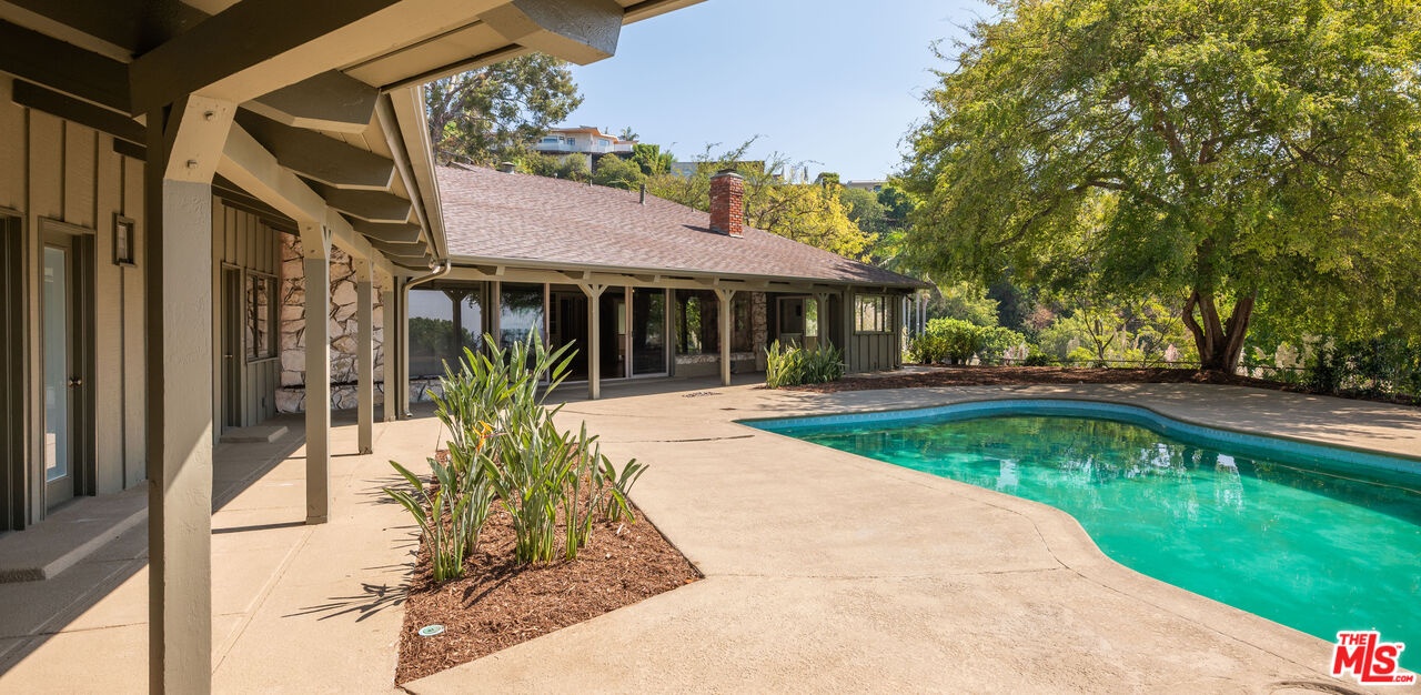 DescriptionBuilt the year Elvis Presley bought Graceland this could be your private haven with lots of space, a view over the City of Angels and style all wrapped into one. On the biggest lot at the end of one of the prime streets in the hills while only two minutes from Sunset, the property is private but with a head on view, an extra-large pool, a pickle ball court, mature trees and parking for many. The house opens to a great room open to two stories with a library above, connecting to a kitchen with breakfast area, two bedrooms and bath upstairs and a bar with game room below. Primary Suite with pool access, dressing room and bath, as well as two additional bedrooms complete this jewel. It brims with architectural details like rock walls, built ins, wood floors and more.NeighborhoodMore listings: