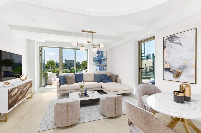 The expansive living and dining area is bathed in natural light from six oversized south and east facing windows, and opens directly onto the terrace. The bedroom accommodates a queen bed and features a deep closet, while every room benefits from year-round warmth and light across multiple exposures.
