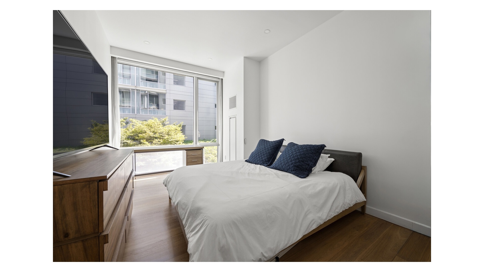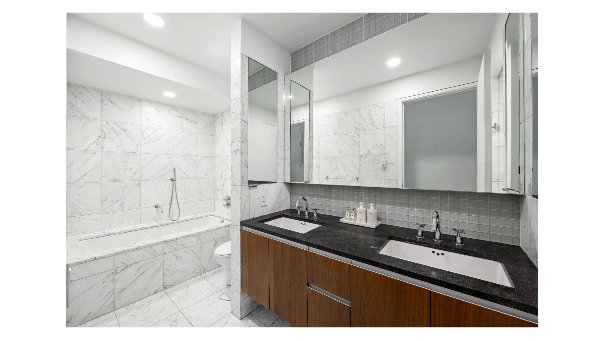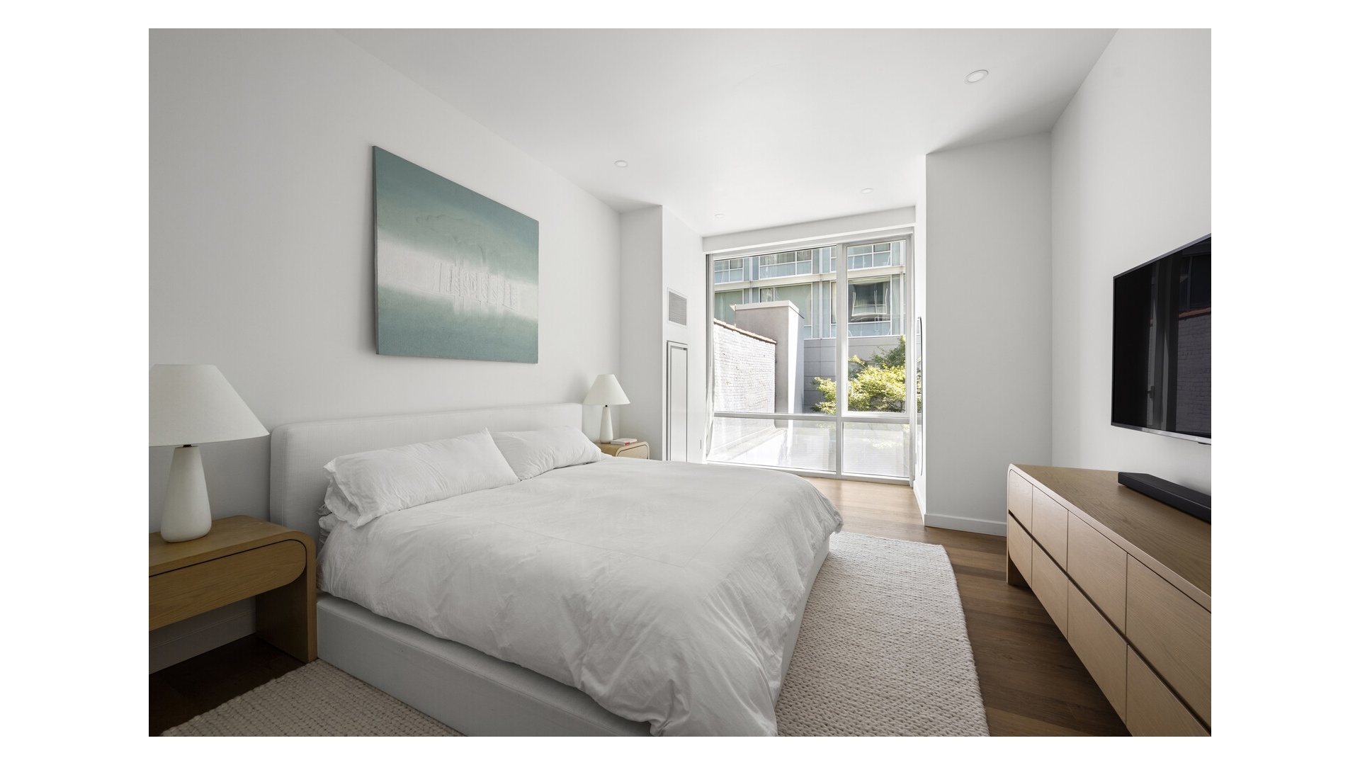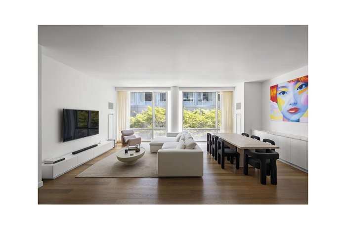 The layout is intelligently designed, with each bedroom fully separated for maximum privacy. The open kitchen is outfitted with sleek Valcucine cabinetry and top-tier appliances from Sub-Zero, Miele, and Gaggenau. The primary suite includes a walk-in closet and a five-piece marble-clad bath with radiant heat, a cast-iron soaking tub, frameless glass shower, and Lefroy Brooks fixtures.