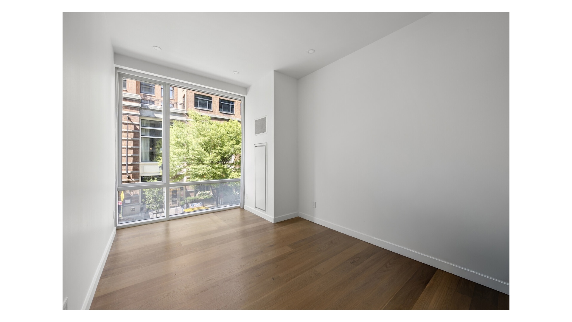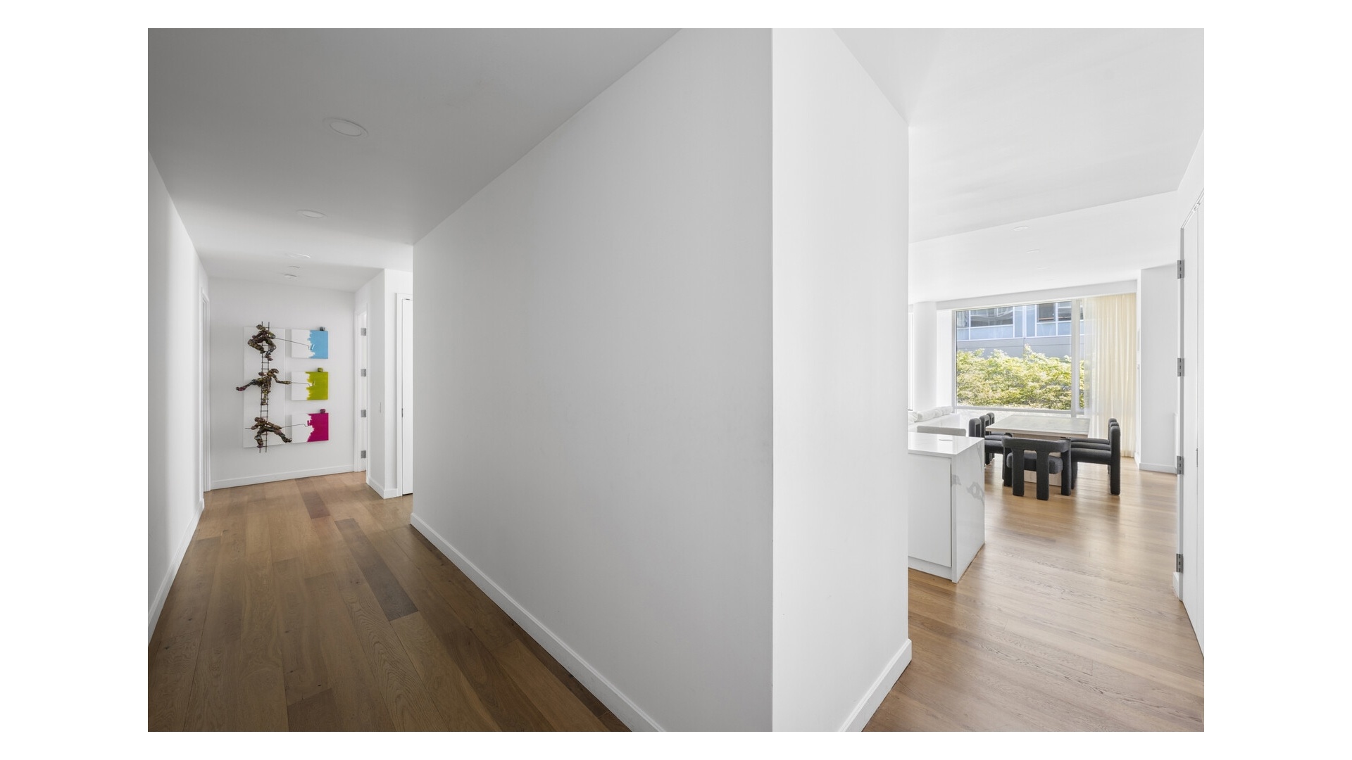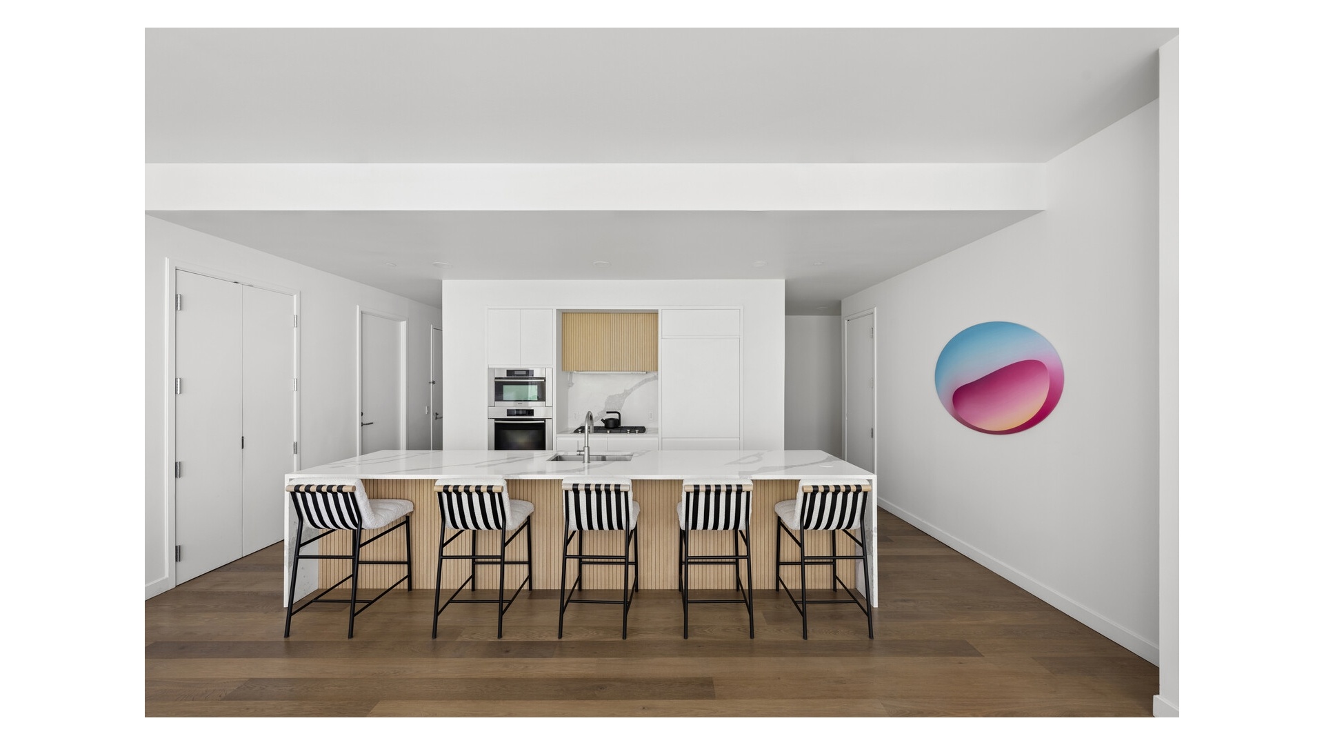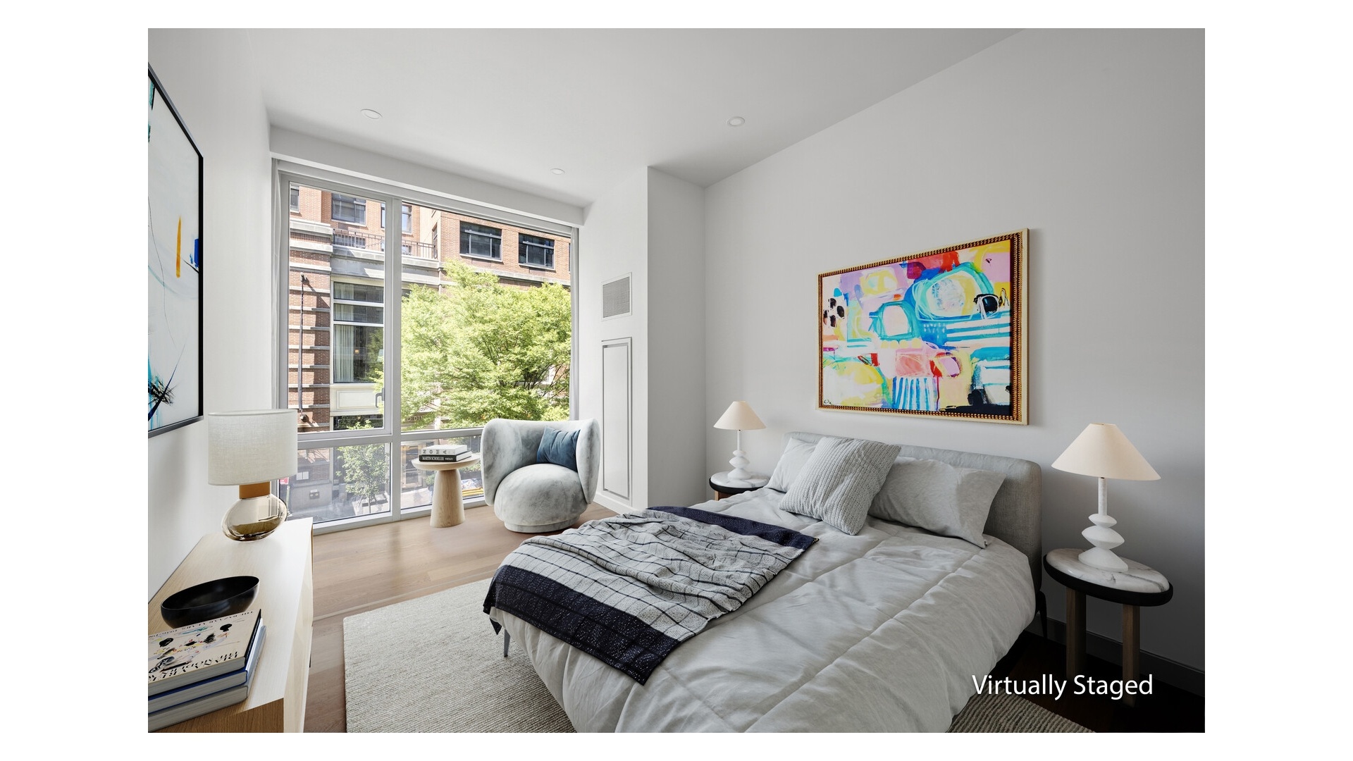 The layout is intelligently designed, with each bedroom fully separated for maximum privacy. The open kitchen is outfitted with sleek Valcucine cabinetry and top-tier appliances from Sub-Zero, Miele, and Gaggenau. The primary suite includes a walk-in closet and a five-piece marble-clad bath with radiant heat, a cast-iron soaking tub, frameless glass shower, and Lefroy Brooks fixtures.