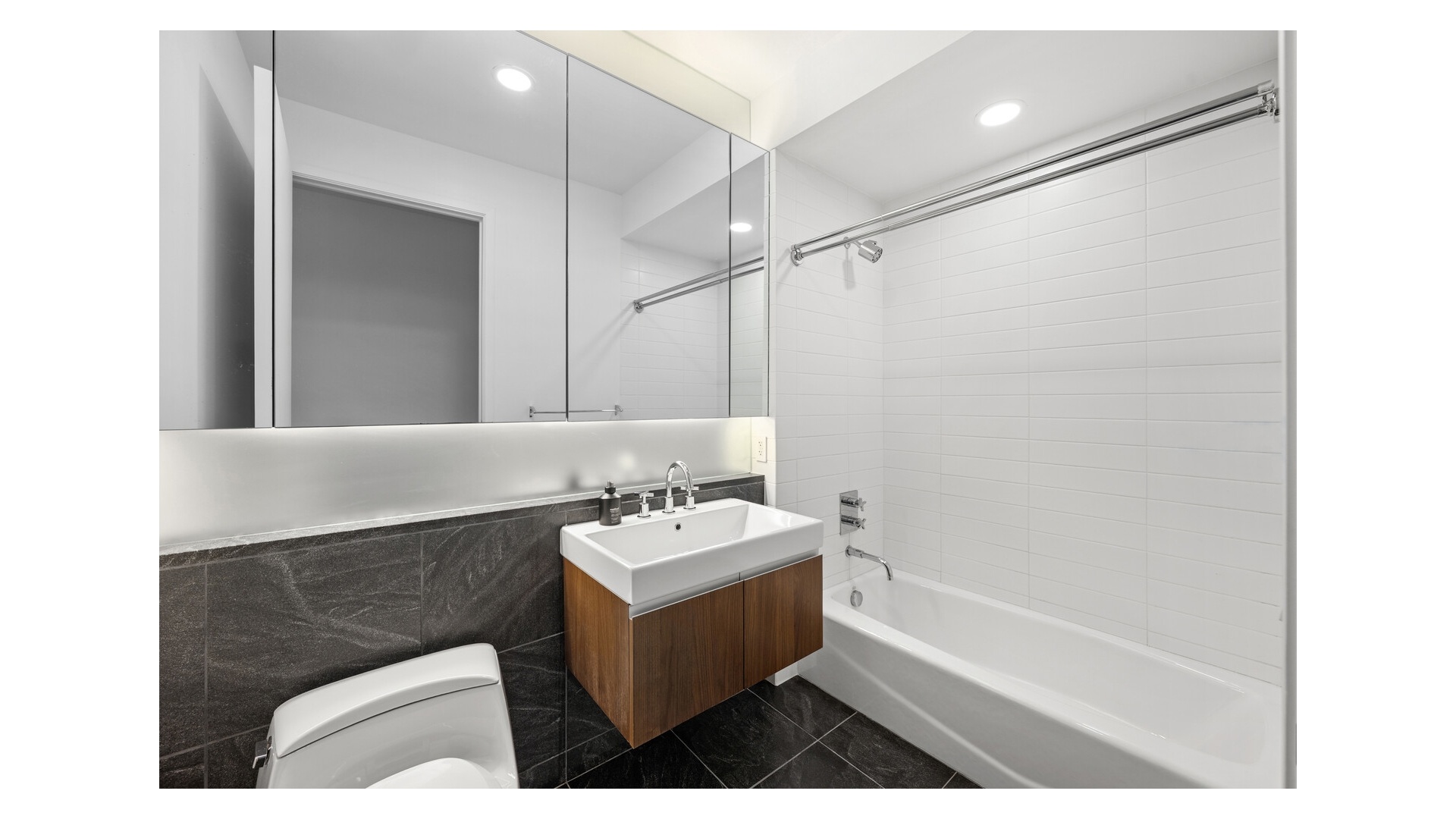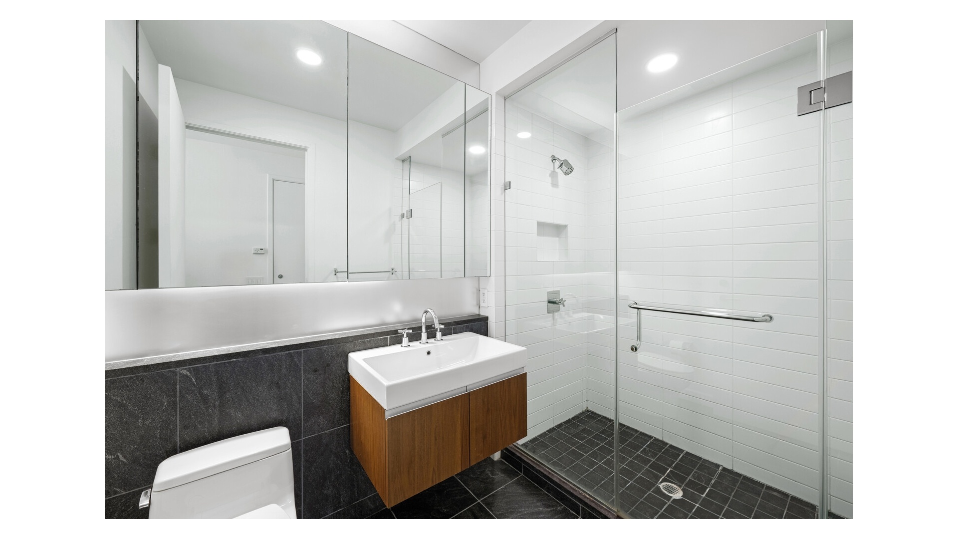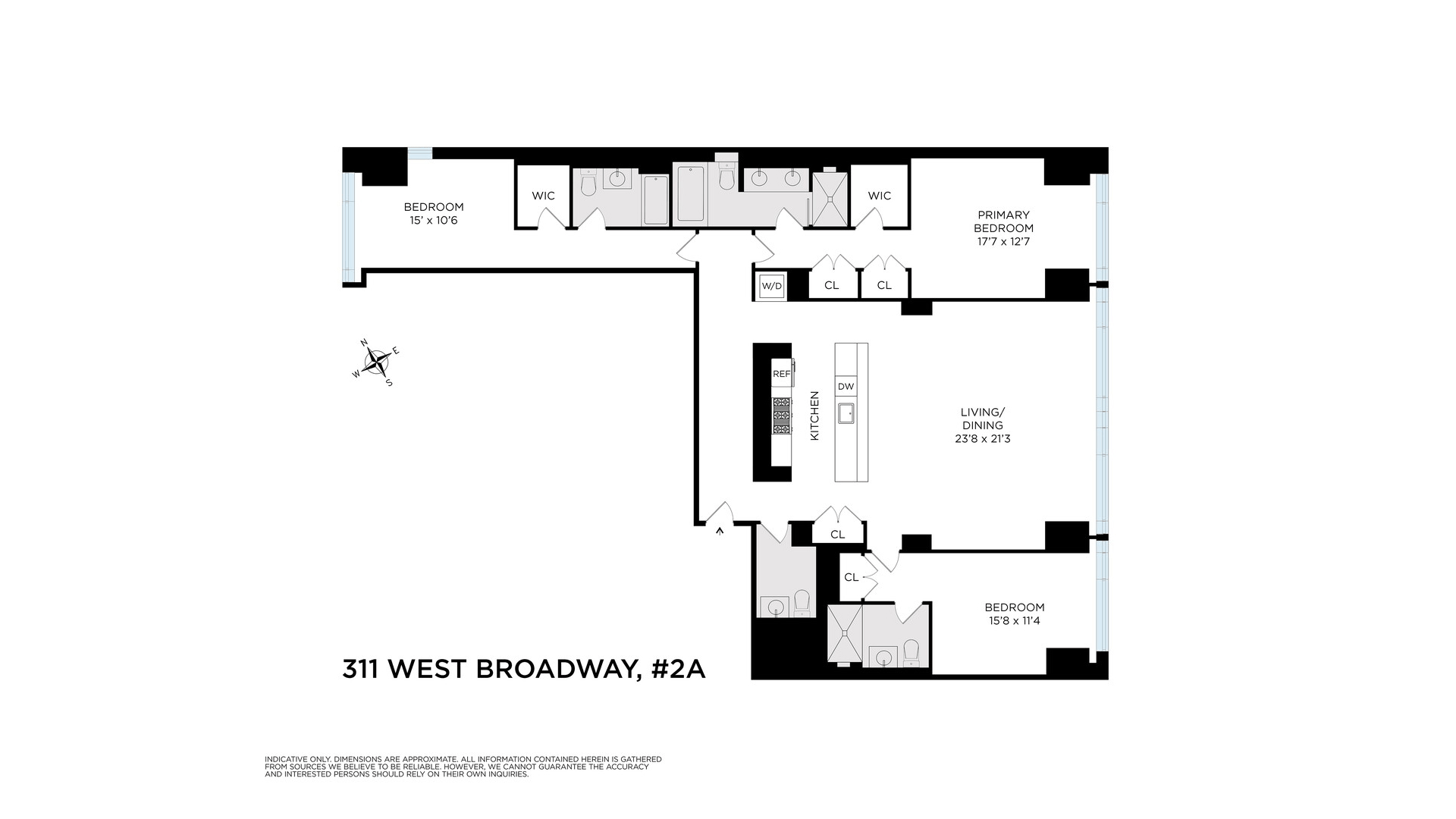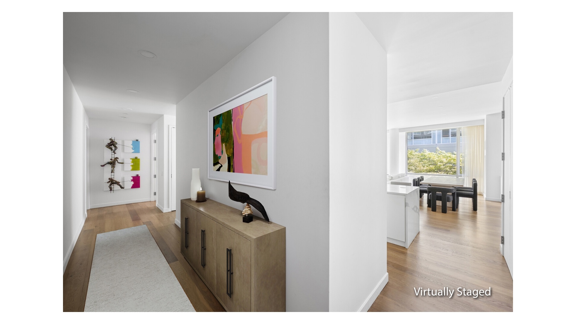 The layout is intelligently designed, with each bedroom fully separated for maximum privacy. The open kitchen is outfitted with sleek Valcucine cabinetry and top-tier appliances from Sub-Zero, Miele, and Gaggenau. The primary suite includes a walk-in closet and a five-piece marble-clad bath with radiant heat, a cast-iron soaking tub, frameless glass shower, and Lefroy Brooks fixtures.