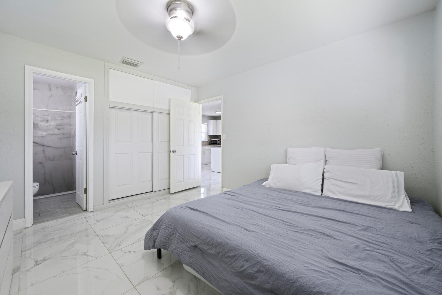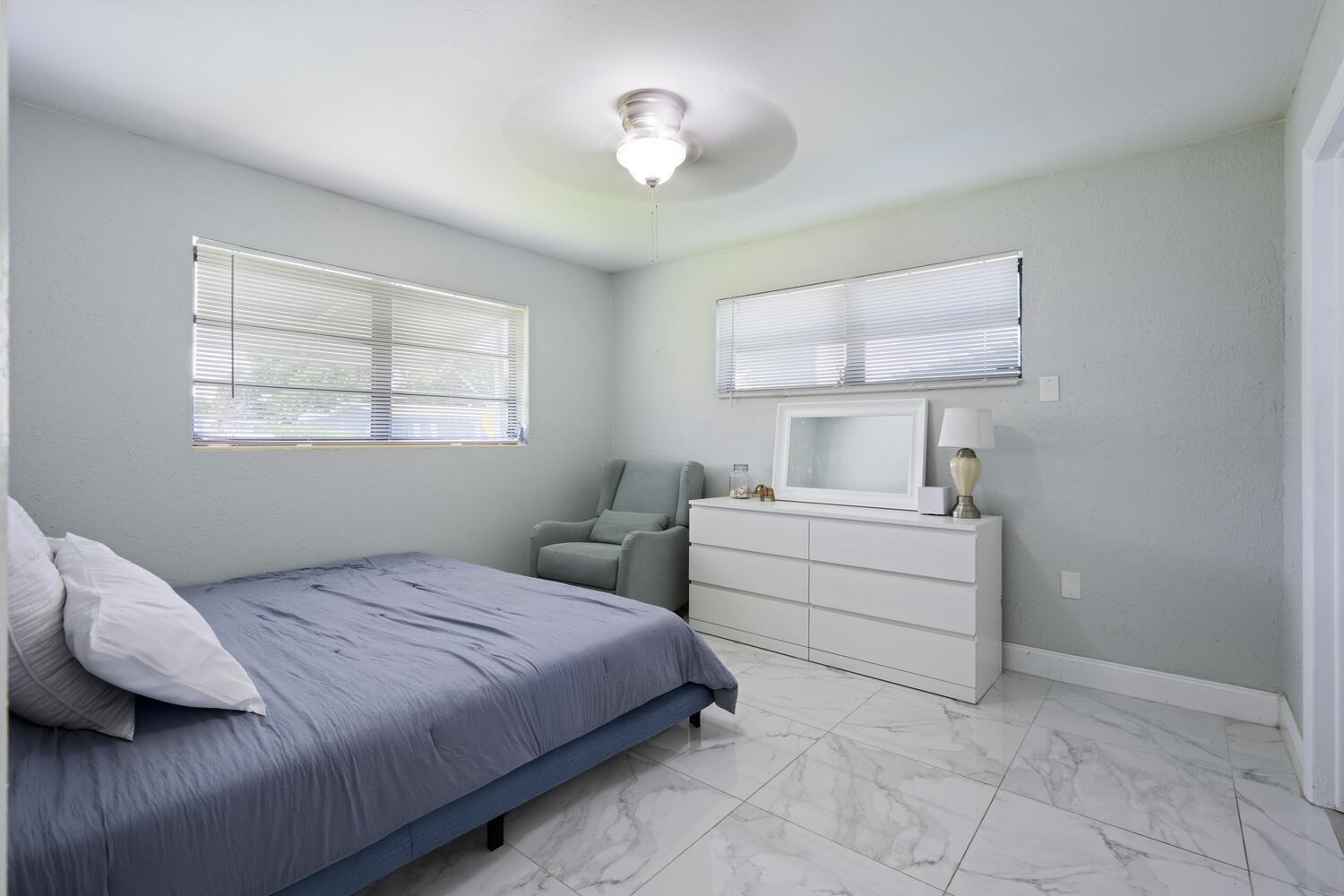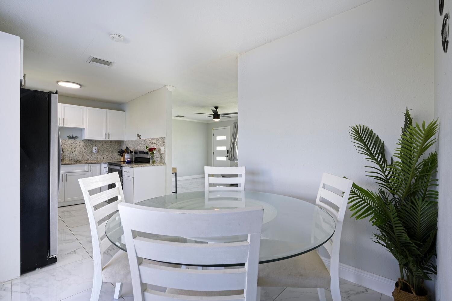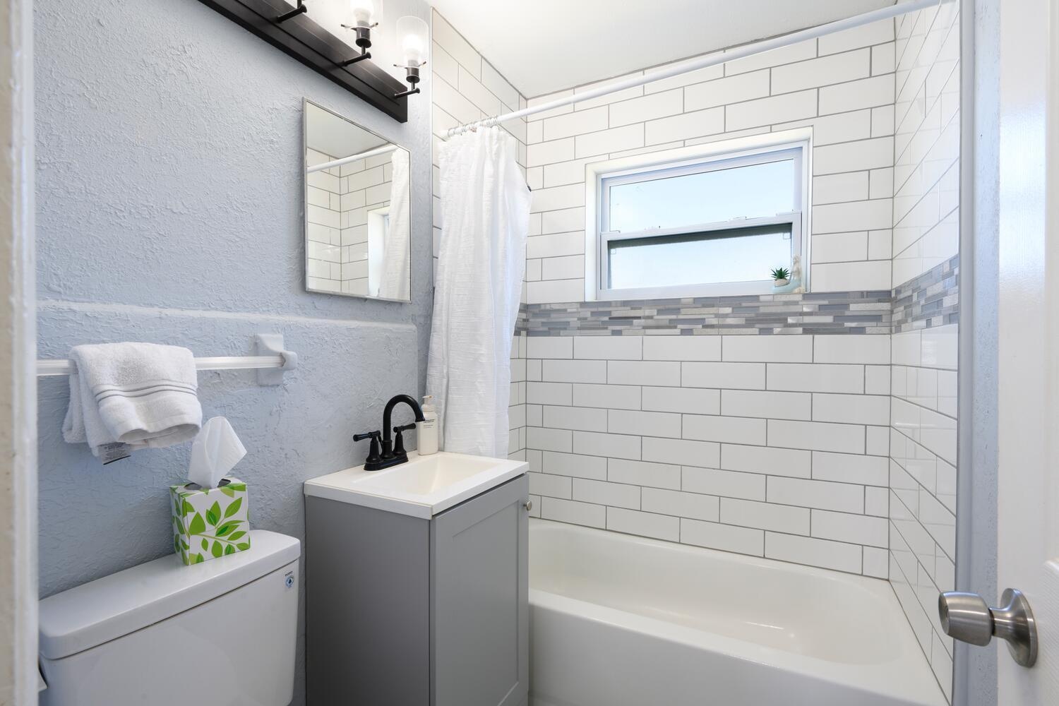 Move-in ready, newly renovated modern home with carport and laundry room with storage. Features include a new roof (2018), new appliances (2023), new water heater (2022), new central air (2022), new front door (2025), and three new rear windows (2023). Freshly painted exterior (2025) and newly epoxy-lined plumbing throughout (2023). Tile floors run throughout the home. Bright, open layout with plenty of natural light.The master suite includes an en suite bathroom with a rainfall shower, marble tile, and modern finishes. Both bathrooms are updated with contemporary lighting and a clean white and gray color scheme. The kitchen features stainless steel appliances, shaker-style cabinetry, and light granite countertops.Enjoy a large yard with mature fruit trees including mango,