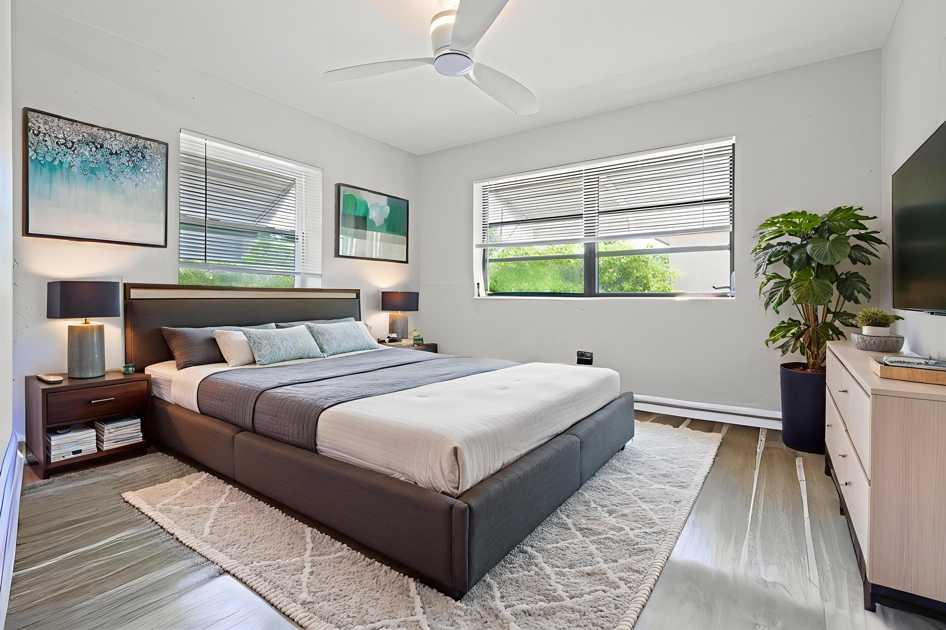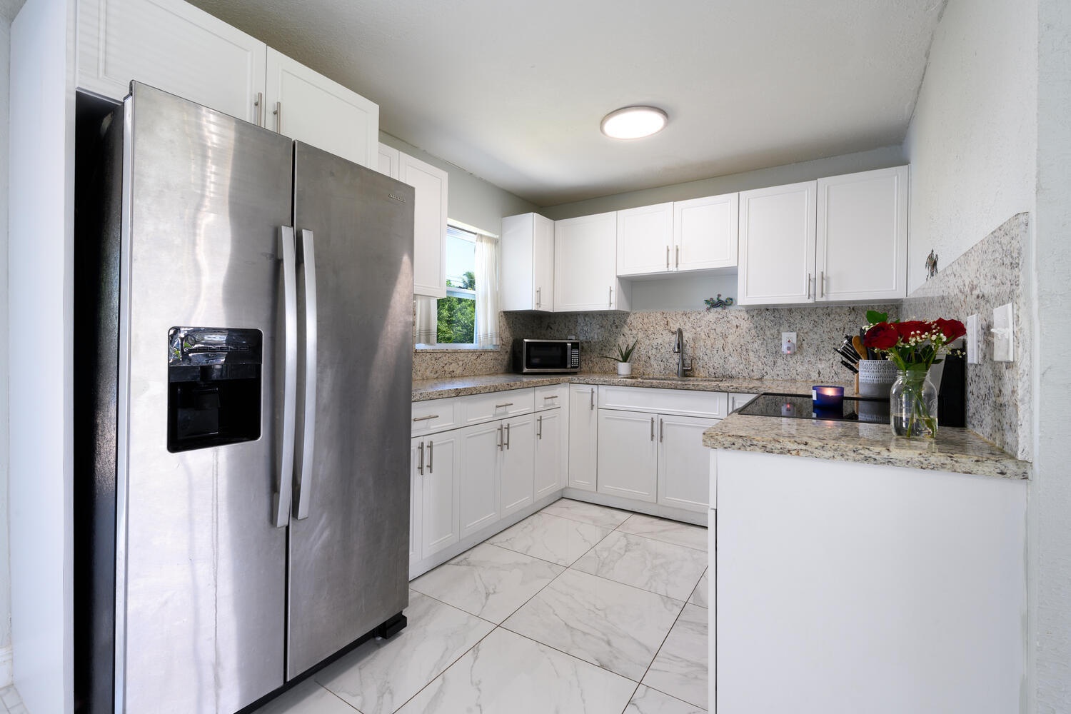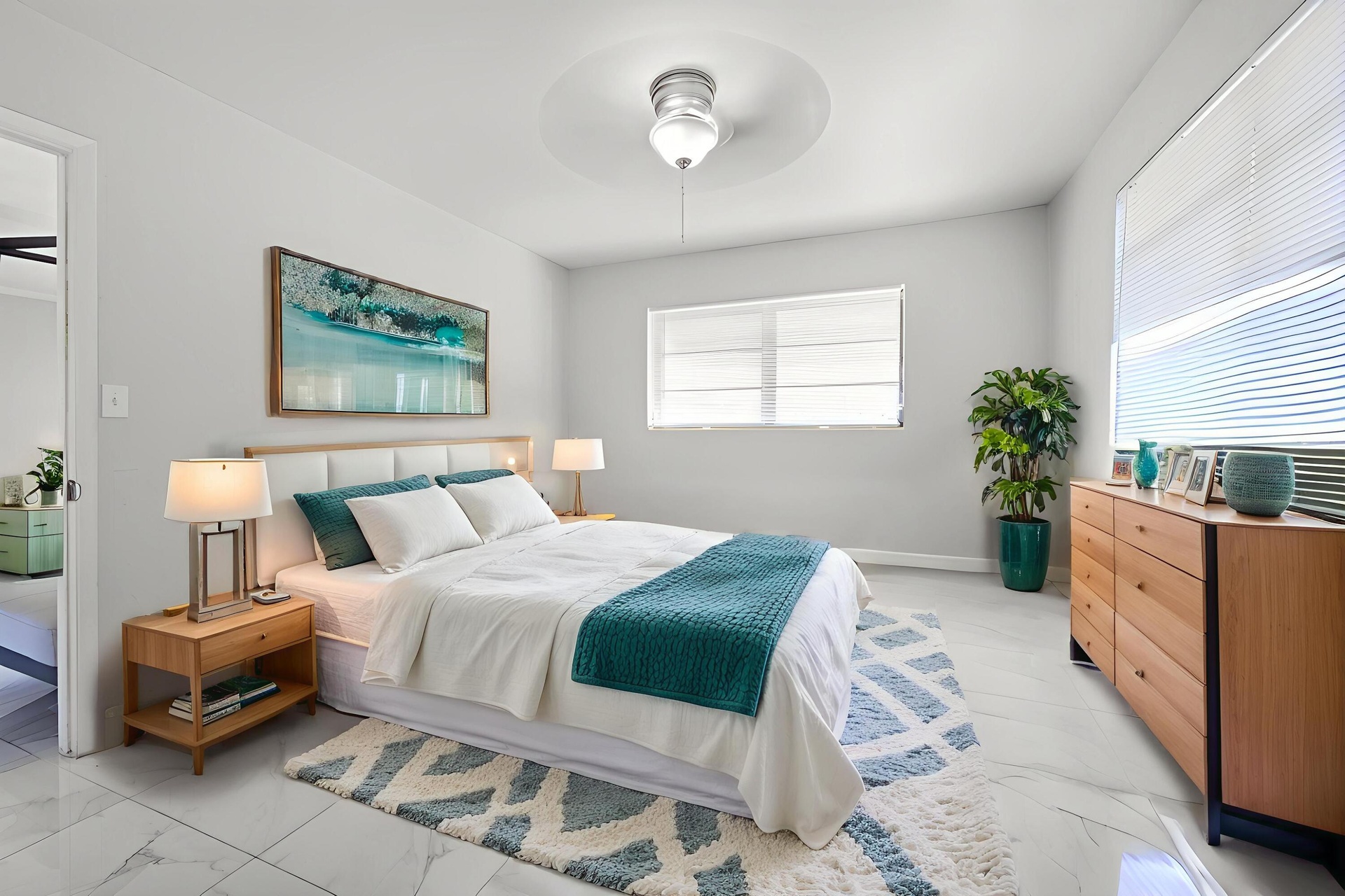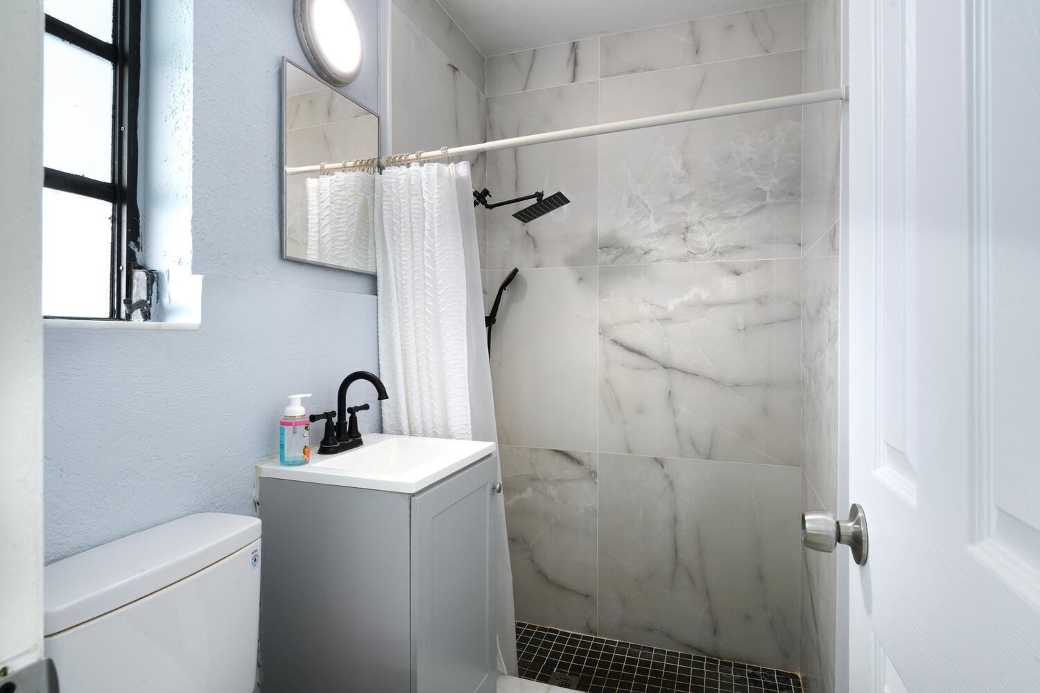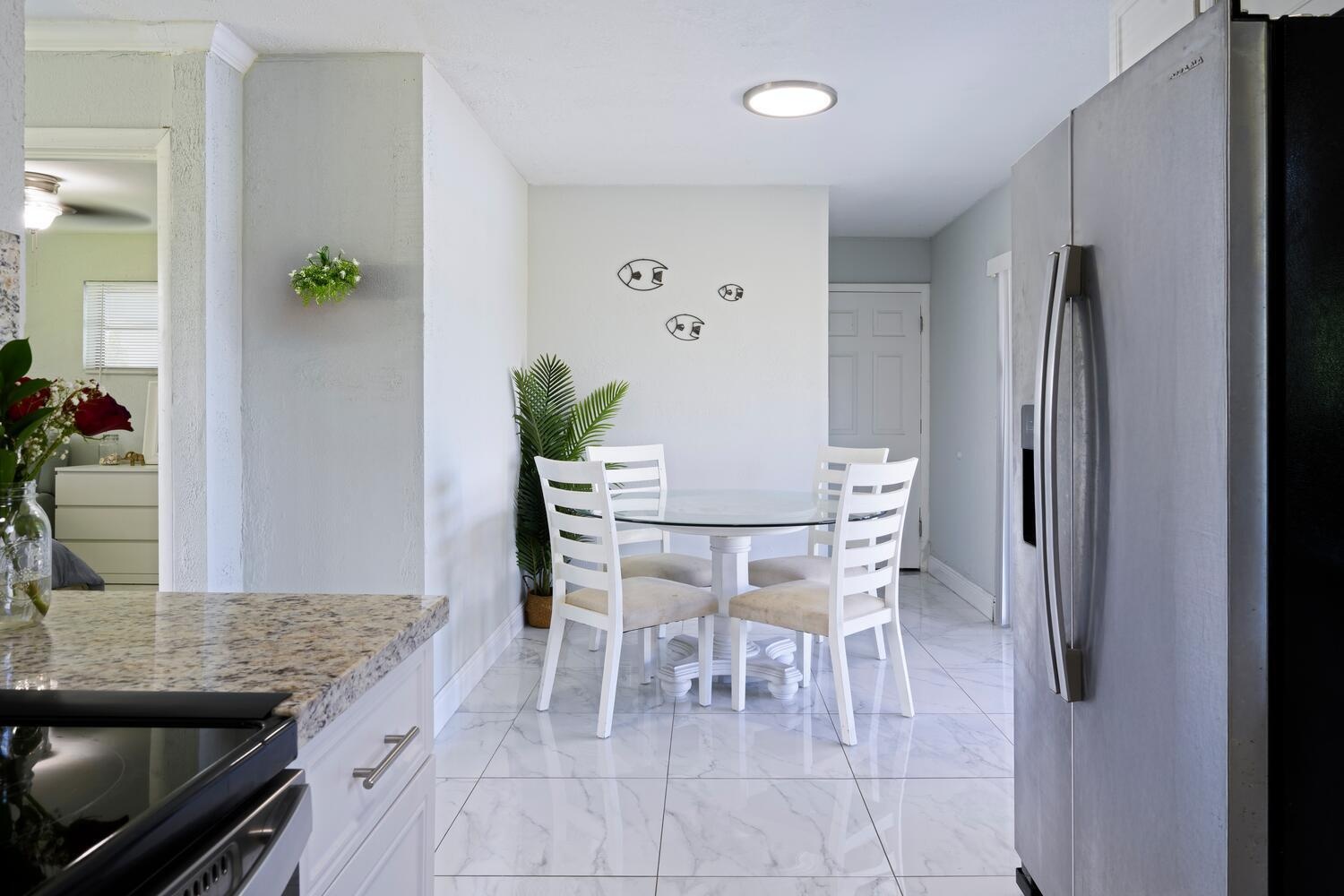 Move-in ready, newly renovated modern home with carport and laundry room with storage. Features include a new roof (2018), new appliances (2023), new water heater (2022), new central air (2022), new front door (2025), and three new rear windows (2023). Freshly painted exterior (2025) and newly epoxy-lined plumbing throughout (2023). Tile floors run throughout the home. Bright, open layout with plenty of natural light.The master suite includes an en suite bathroom with a rainfall shower, marble tile, and modern finishes. Both bathrooms are updated with contemporary lighting and a clean white and gray color scheme. The kitchen features stainless steel appliances, shaker-style cabinetry, and light granite countertops.Enjoy a large yard with mature fruit trees including mango,