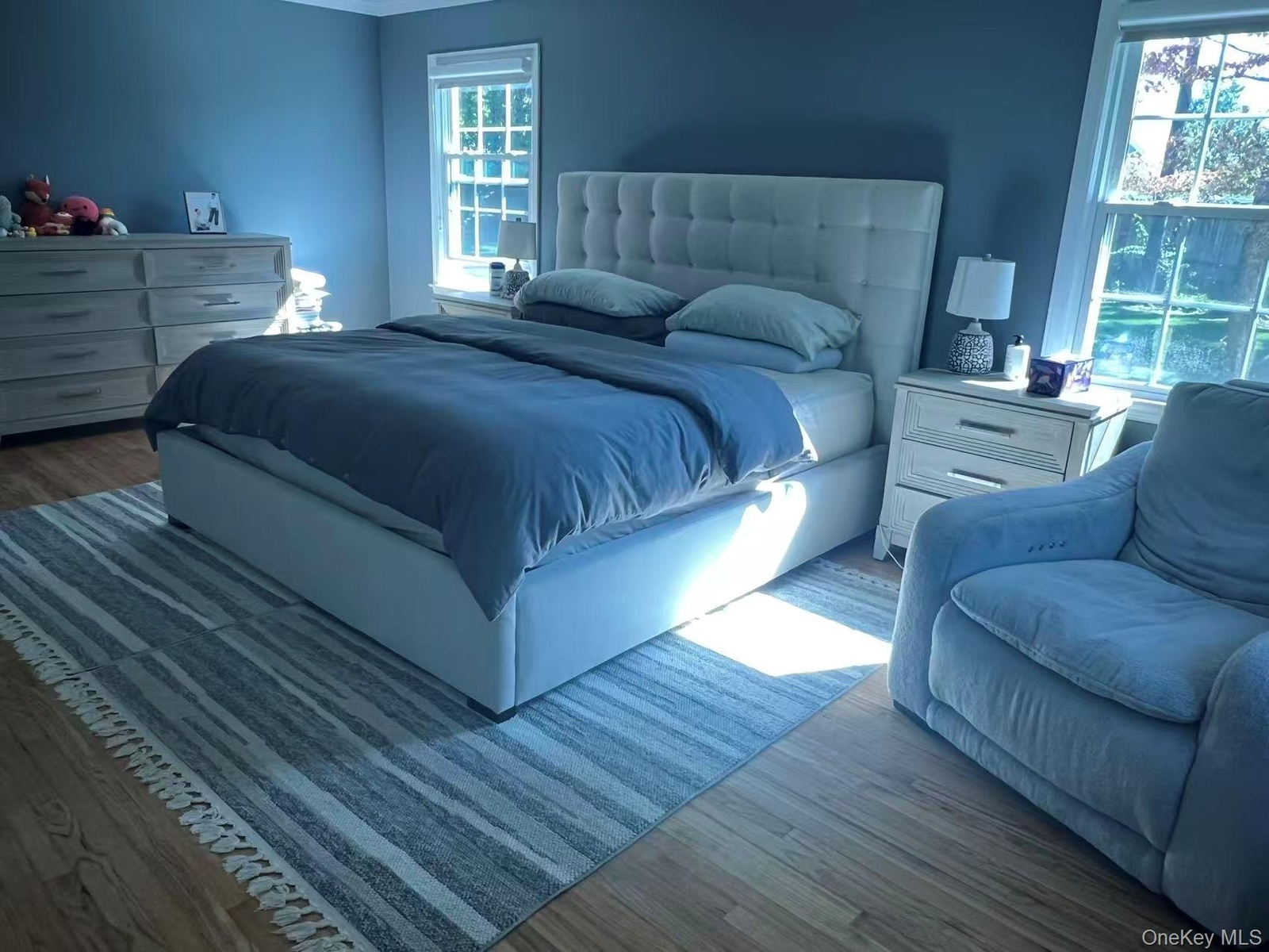 - Bedroom with light wood-style flooring, a baseboard radiator, and a closet