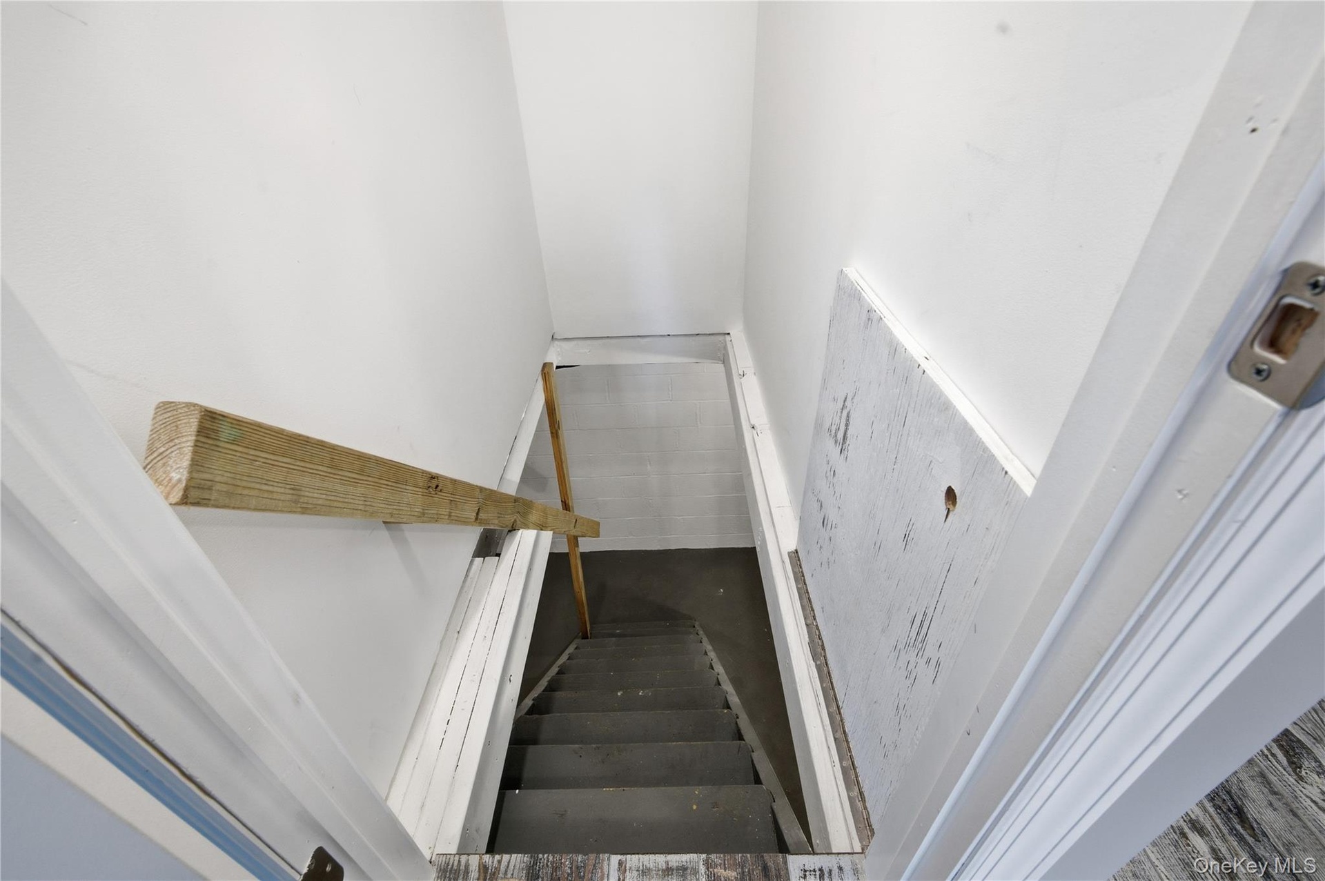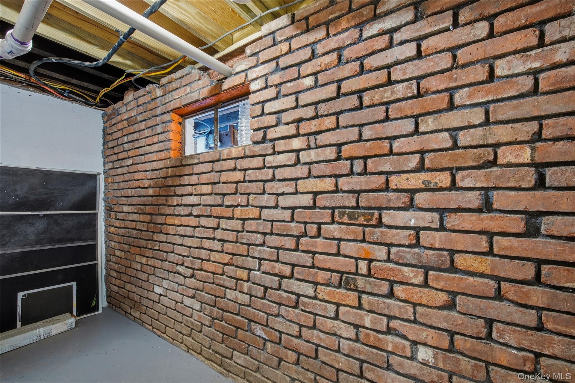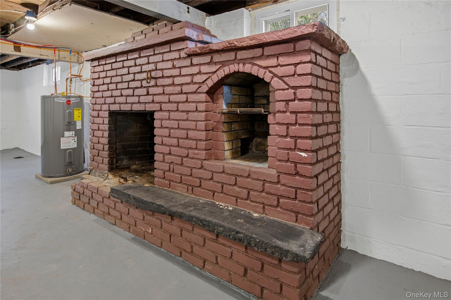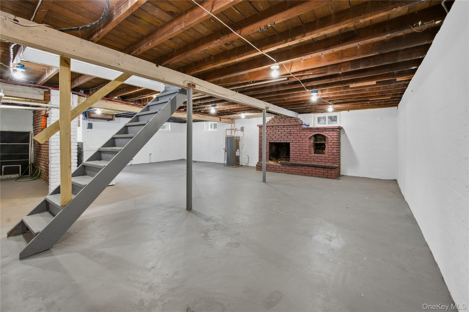 - Unfinished basement with stairs, a fireplace, and electric water heater