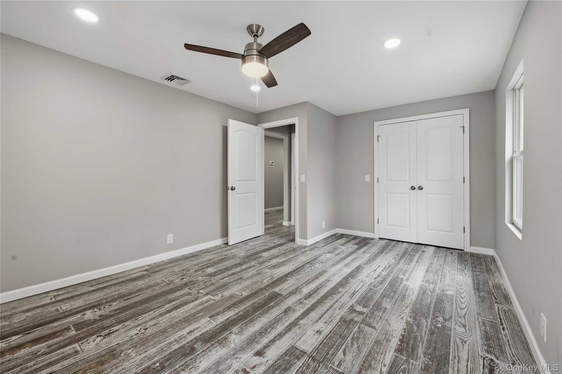- Unfurnished bedroom featuring a ceiling fan, recessed lighting, wood finished floors, and a closet