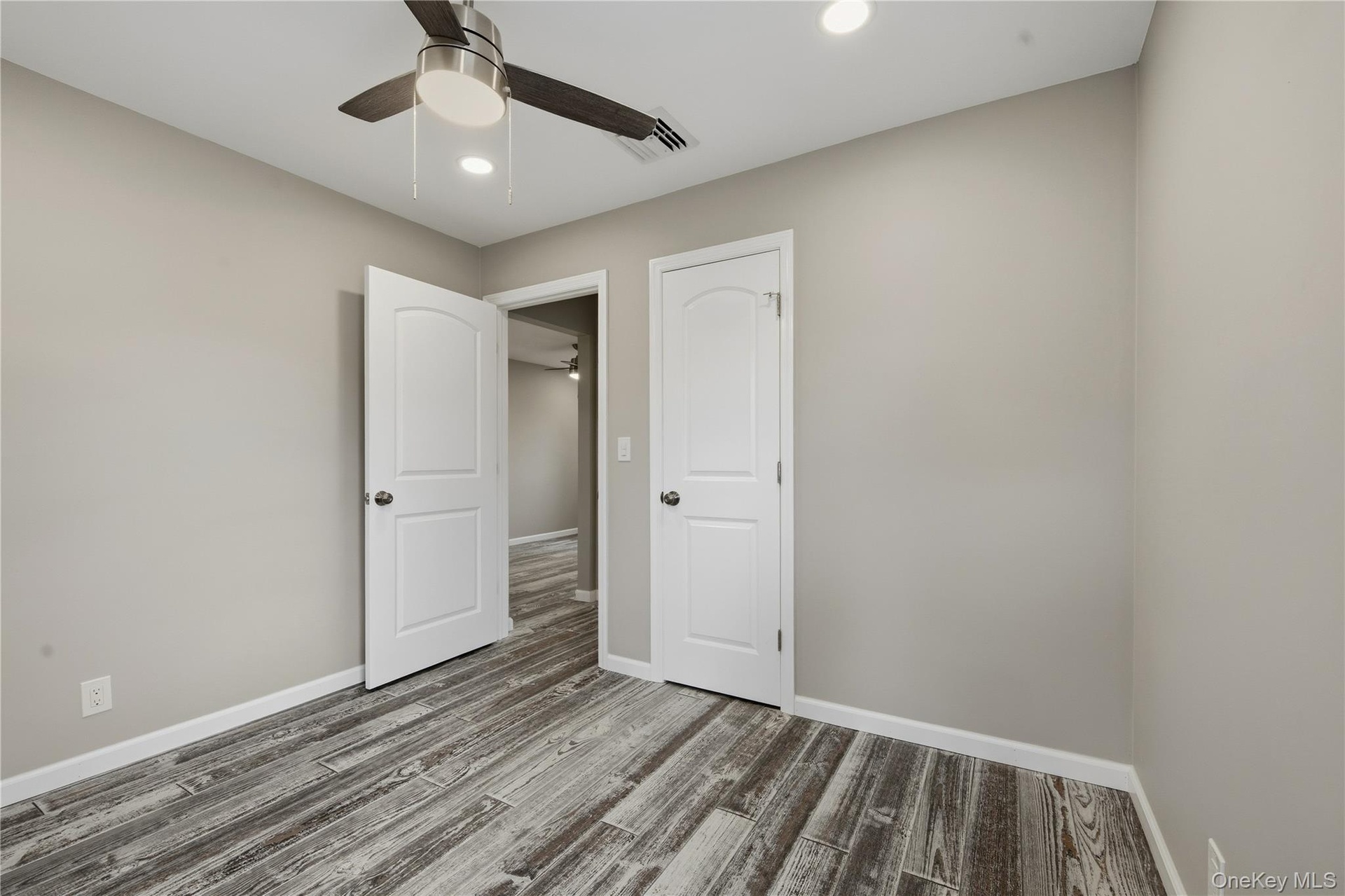 - Unfurnished bedroom featuring wood finished floors, ceiling fan, and recessed lighting