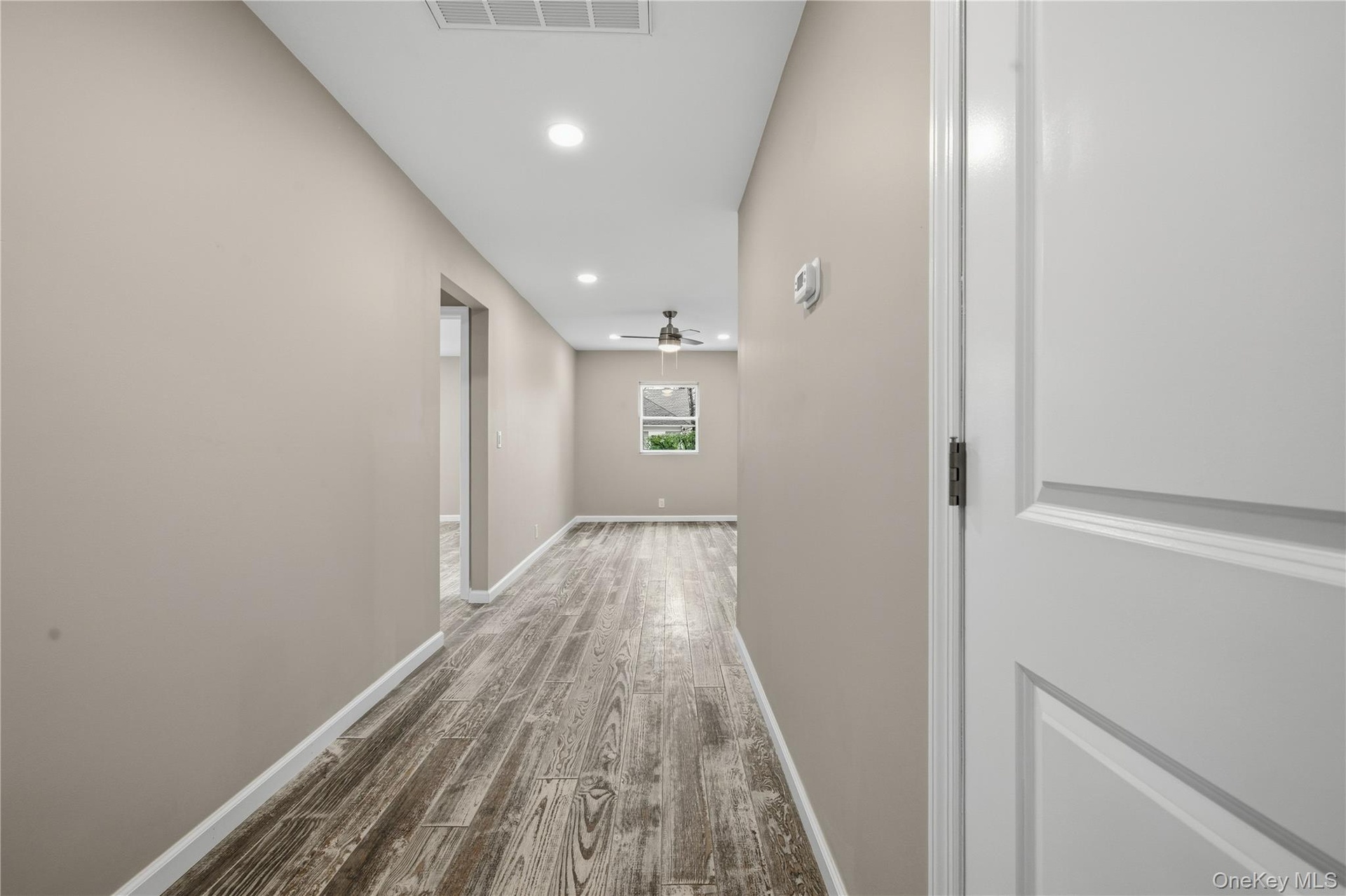 - Hall with an upstairs landing, wood finished floors, and recessed lighting