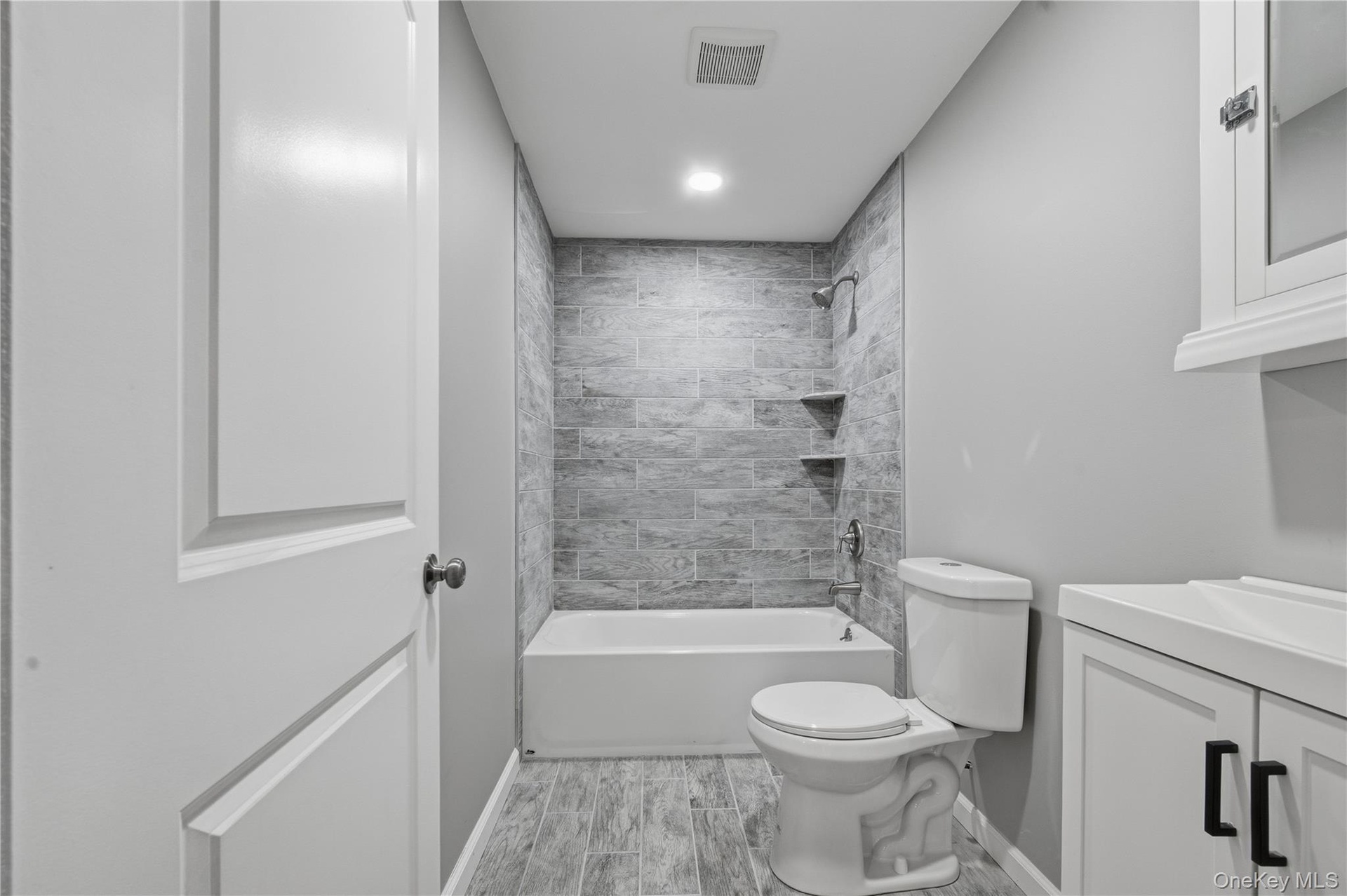 - Bathroom with vanity, shower / bathtub combination, wood tiled floors, and recessed lighting
